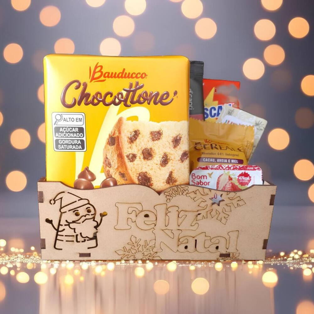 Saboreie o Natal com a cesta mini Encanto Flork Feliz Natal! Com um Chocottone irresistível, e delíciosos itens para um Café da Manhã ou tarde. Uma explosão de sabor para presentear nesta data! Personalizada com a frase Feliz Natal, essa Cesta é um presente que encanta e emociona. Perfeita para presentear quem você ama e celebrar essa data especial com muito estilo! Itens na Cesta: 1 Chocottone 80g + 1 Café Solúvel + 1 Nescau caixinha + 1 Biscoitinho Balducco + 1 Geléia + 1 sachê de açucar . Embalada com saco celofane e lindo laço. úcia