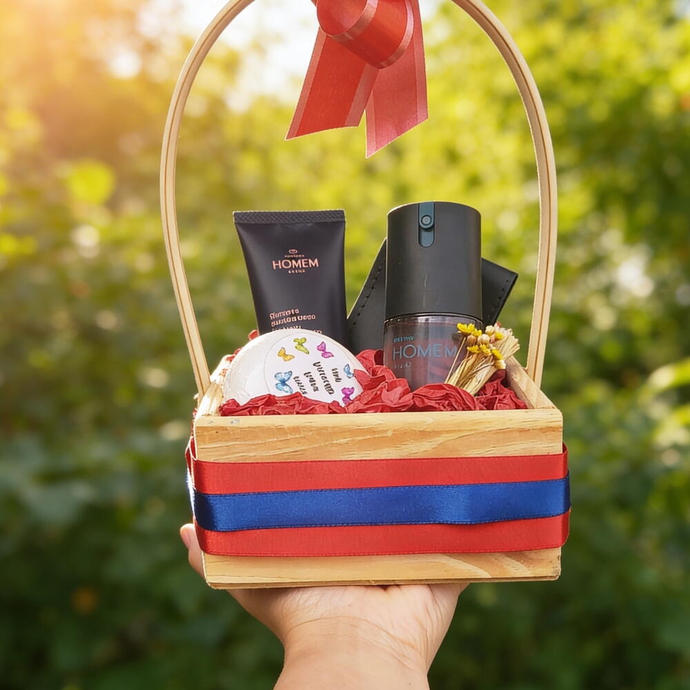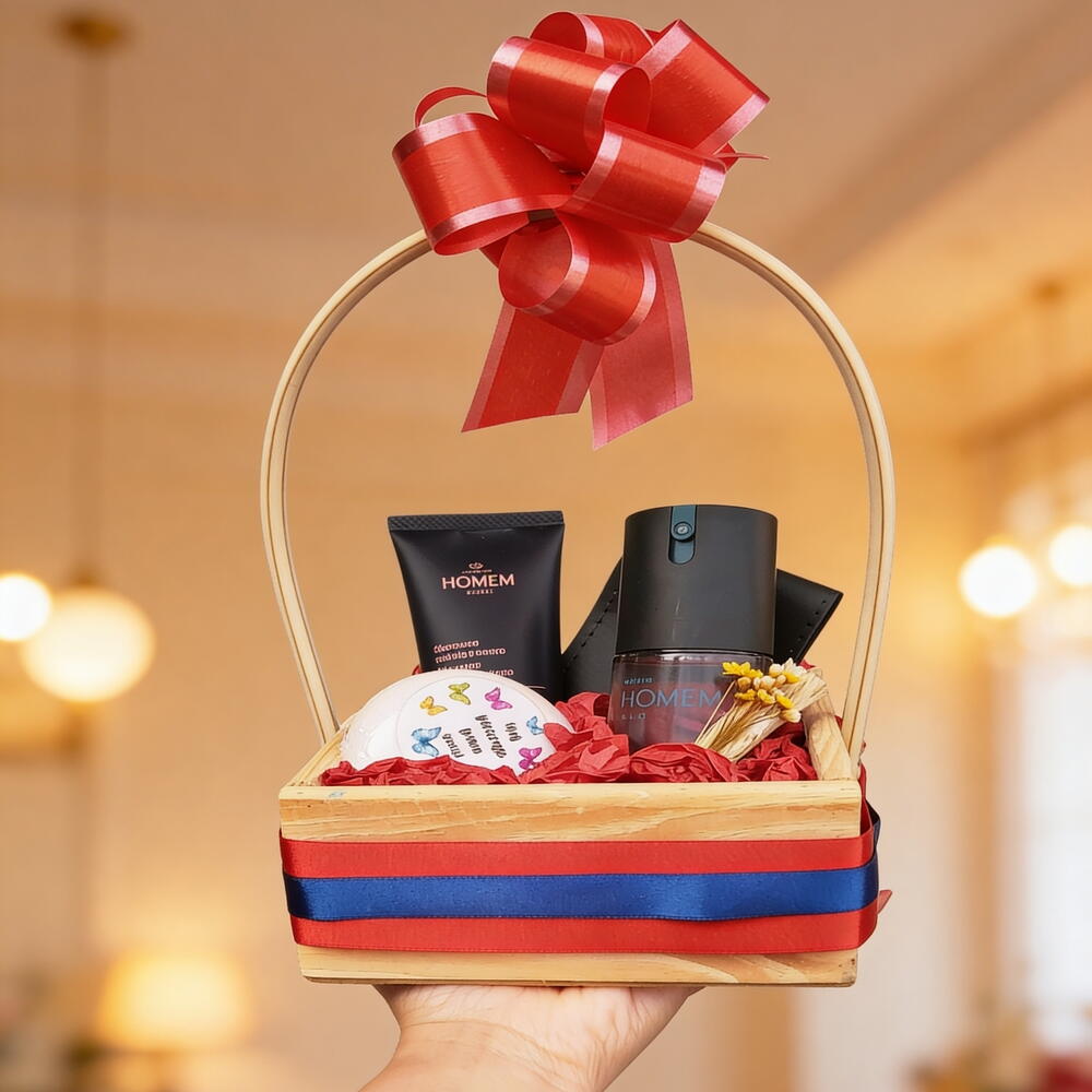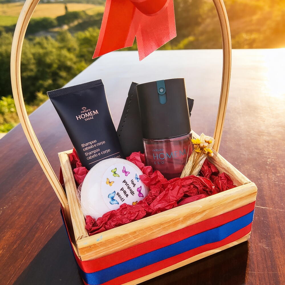 laço e saco - 1 un. flores secas coloridas - 1 un. porta cartão em couro - 1 un. sabonete jequiti 80g - 1 un. cesta em nadeira - 1 un. shampoo cabelo e corpo natura homem - 1 un. colônia masculino corporal natura homem 100ml - 1 un.