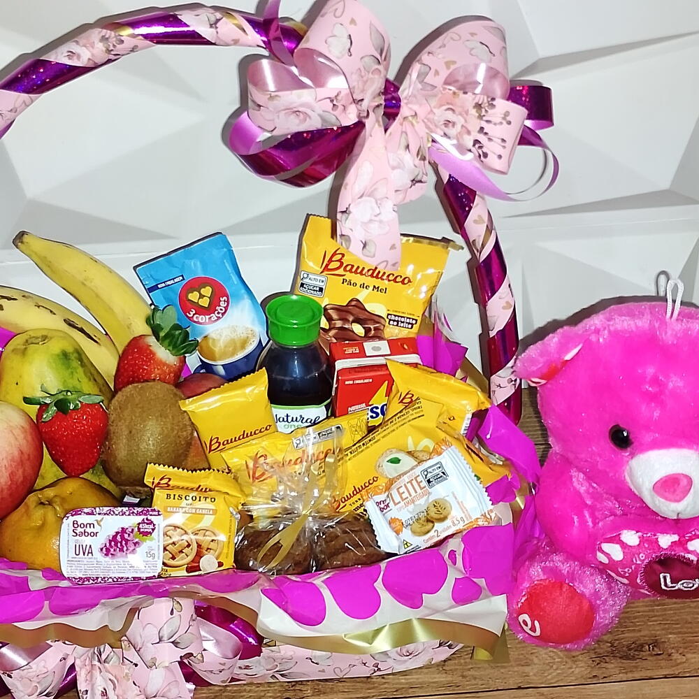 Presenteie com esta magnífica Cesta de Café da Manhã que oferece uma variada seleção de frutas frescas, incluindo 1 maçã, 2 bananas, 1 mamão, 1 kiwi, 3 morangos, 1 manga, 1 tangerina e 1 pera. Contém ainda uma deliciosa torrada Bauducco, acompanhada de uma doce geleia, e um pão de mel Bauducco. No segmento de bebidas, a cesta conta com um sachê de café com leite 3corações, um Nescau em pó, e um suco natural 100% para começar o dia com energia. Além disso, traz a satisfação garantida com um bolinho Bauducco com gotas de chocolate, biscoito Bauducco de leite e biscoito de saquinho. O toque final vem com um maizena de 9g e um duo Balducco. A cereja do bolo é um encantador urso de pelúcia de 20 cm, perfeito para surpreender e tocar o coração de quem você gosta. É a opção ideal para começar o dia com um sorriso.