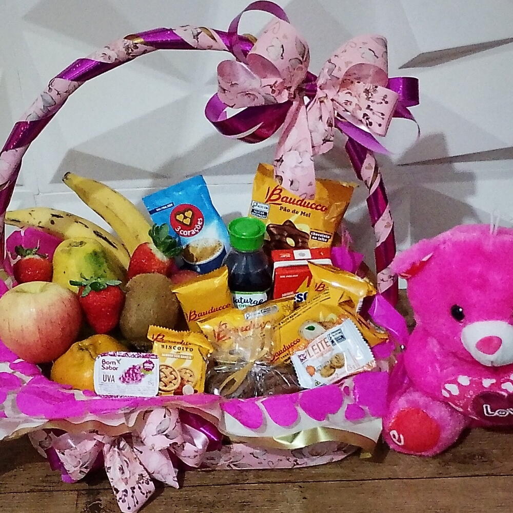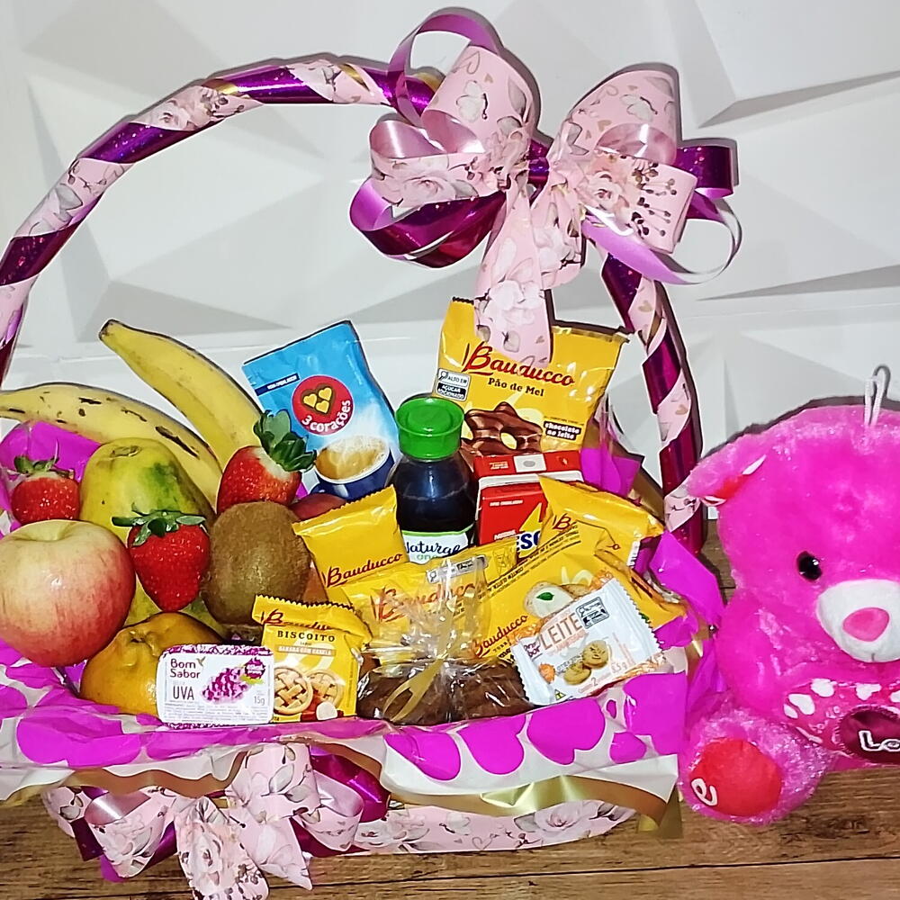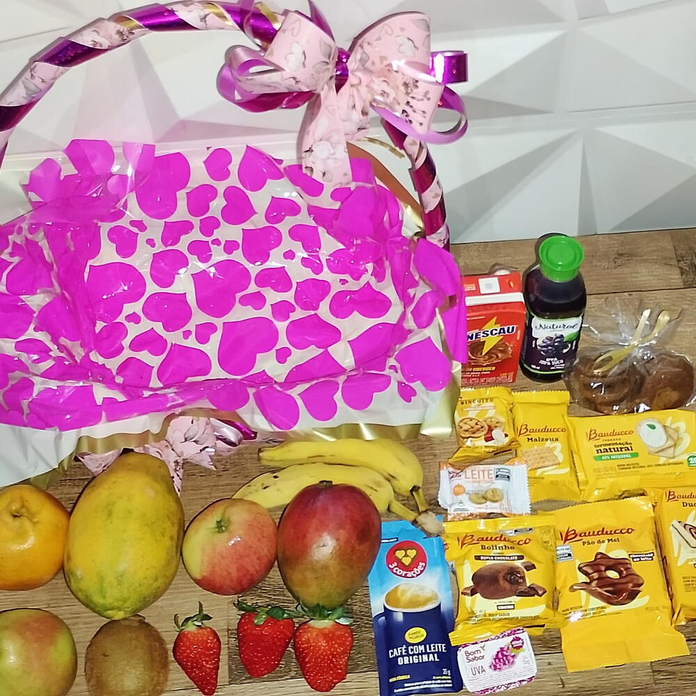maçã - 1 un. banana - 2 un. torrada bauducco - 1 un. geleia - 1 un. mamão - 1 un. kiwi - 1 un. morango - 3 un. manga - 1 un. tangerina - 1 un. pêra - 1 un. nescau - 1 un. café com leite (3corações) sachê - 1 un. maizena 9g - 1 un. duo balducco - 1 un. urso 20 cm - 1 un. pão de mel ( bauducco ) - 1 un. suco natural 100% - 1 un. bolinho bauducco gotas de choco - 1 un. biscoito bauducco leite - 1 un. biscoito de saquinho - 1 un.