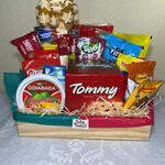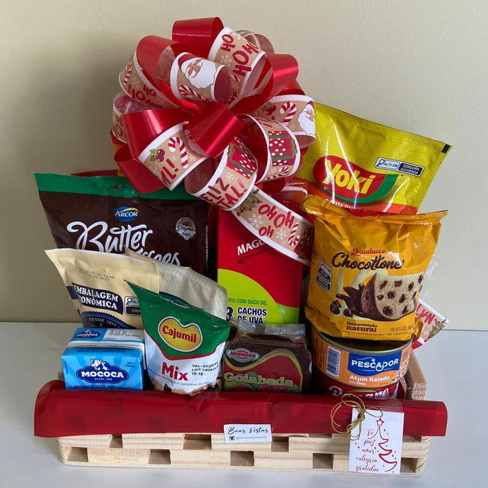suco de uva - 1 un. torrone - 1 un. sequilho - 1 un. cesta de palha - 1 un. paçoquita - 1 un. castanha - 1 un. azeitona - 1 un. suco em pó - 1 un. gelatina - 1 un. panetone - 400 gr. embalagemdecoração - 1 un. bombons butter toffees - 1 un. atum enlatado - 1 un. batata palha - 1 un. macarrão penne - 1 un. milho verde - 1 un. molho de tomate - 1 un. maionese - 1 un. creme de leite - 1 un. doce de goiaba - 1 un.