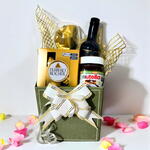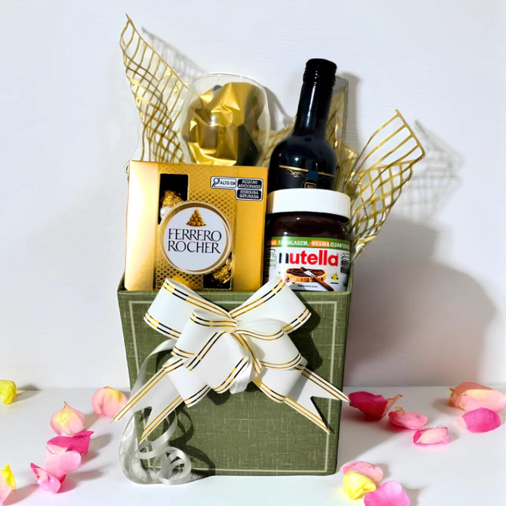 Para comemorar com estilo e romance. Composição: - 1 Ferrero Rocher 50g; - 1 Vinho tinto suave Del Grano 245ml; - 1 Taça de vinho de vidro; - 1 Nutella 140ml; - 1 Cachepot de cartonagem.