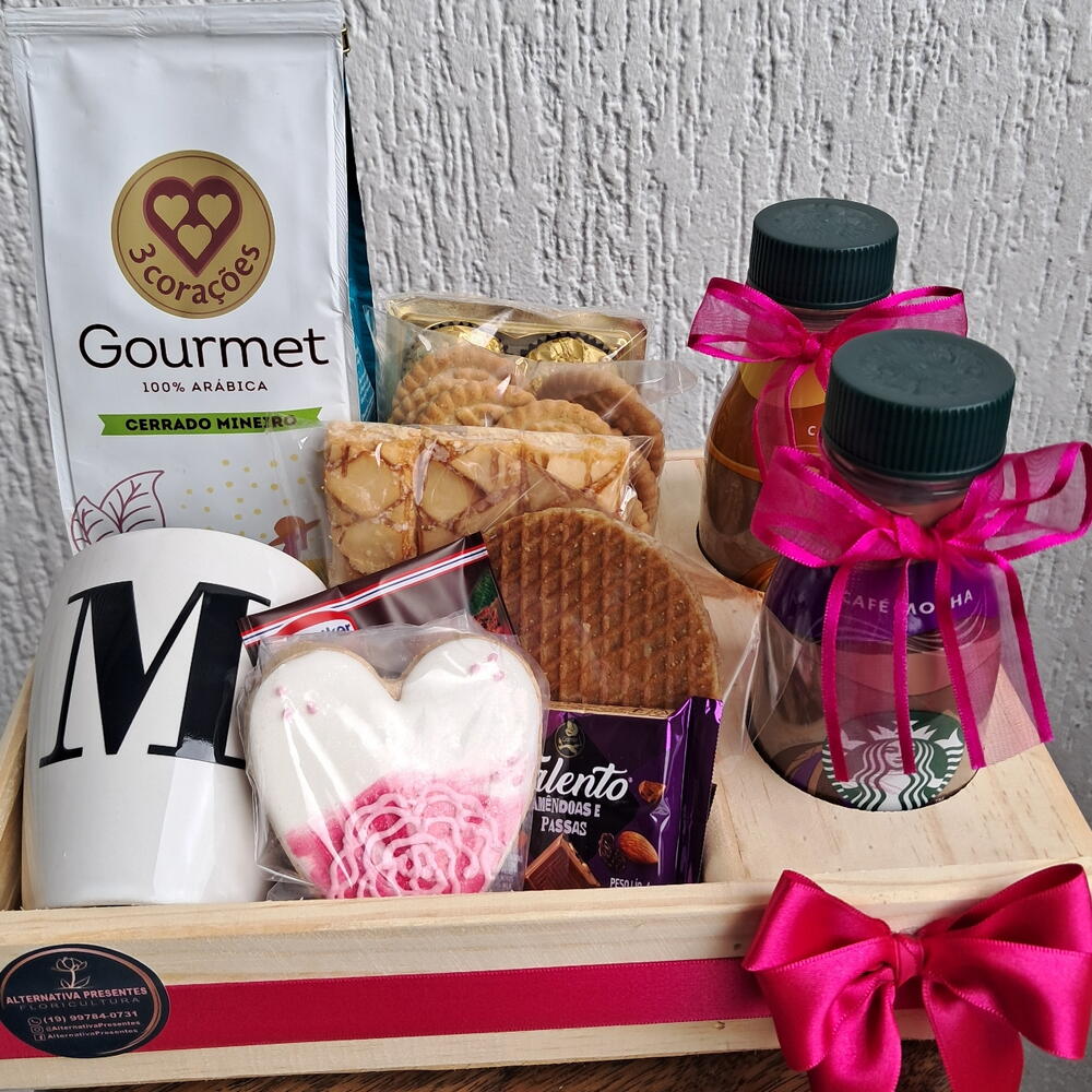 café arábica - 1 un. biscoitos amanteigado - 1 un. bolacha - 1 un. caixa madeira decorada com fita - 1 un. sachê de cha - 1 un. frappuccino starbucks - 1 un. café gourmet - 1 un. cesta madeira decorada - 1 un. biscoito personalizado dia da mulher - 1 un. sfogliatine italiano folhado - 1 un. frappuccino starbucks 280ml - 1 un. sfogliatine - 1 un. talento castanha 25g - 1 un. caneca personalizada com inicial nome - 1 un. biscoito amanteigado enfeitado - 1 un. moca starbucks - 1 un. starbucks frappuccino com canela - 1 un. café torrado e moído gourmet 100% arábica - 1 un. bolacha holandesa - 1 un. tostines maçã e canela - 1 un.