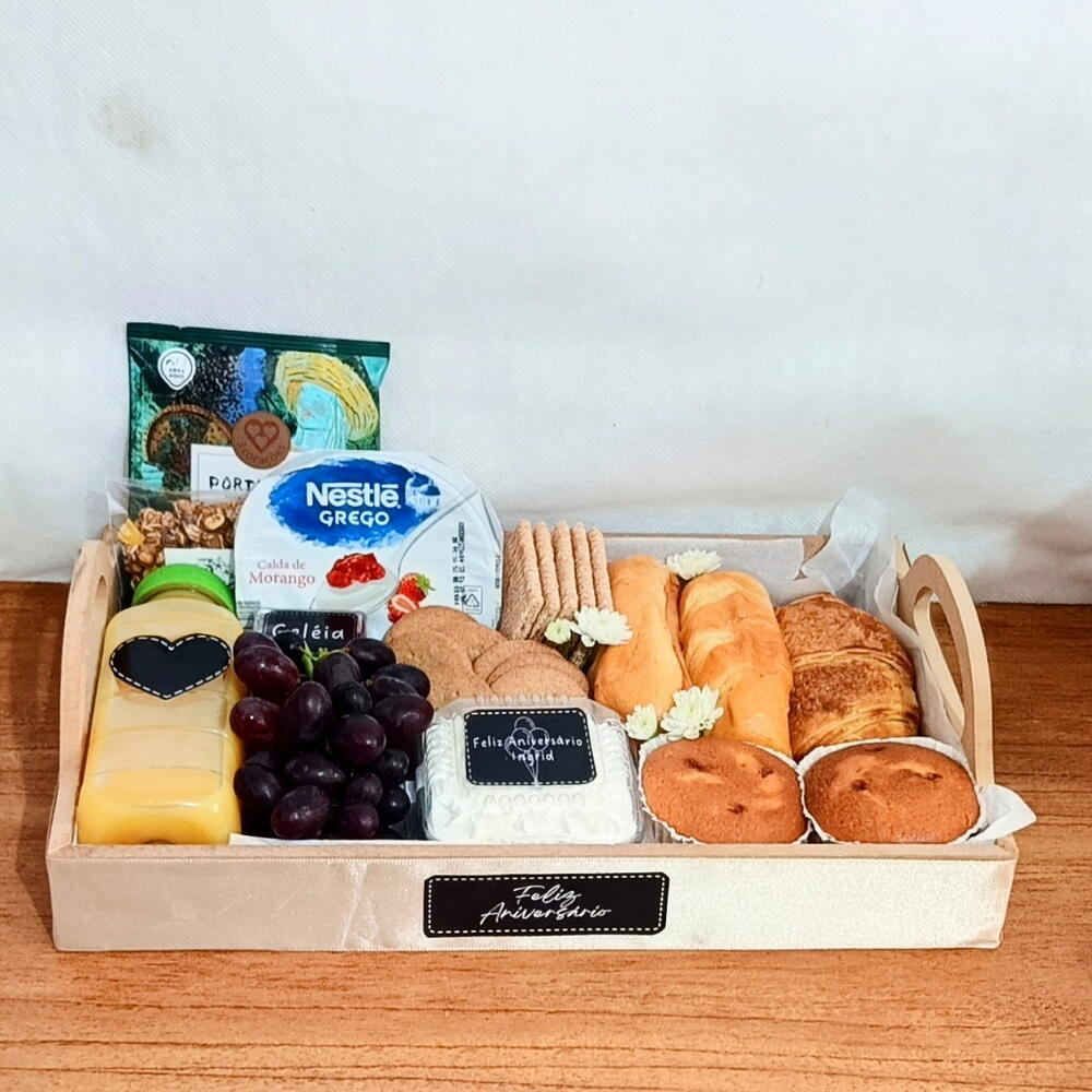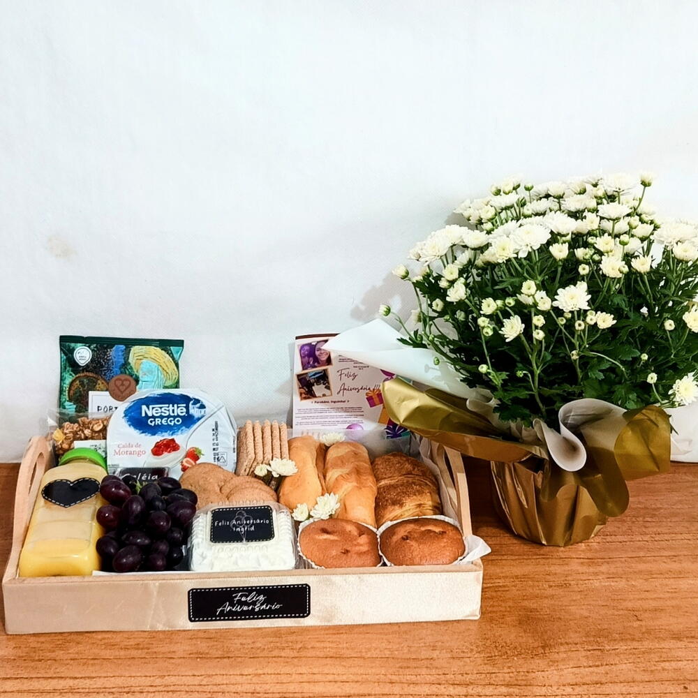 Celebre momentos especiais com nossa Cesta de Aniversário! Recheada com uma seleção deliciosa que inclui as seguintes delícias: uma unitária de flor para adicionar um toque de charme, um iogurte suave e cremoso, um suco refrescante, um pacote de biscoitos para um lanche rápido, pães de leite macios ao toque, uma porção de granola para um impulso energético, dois irresistíveis bolinhos pequenos de 40g, um salgado para um sabor a mais, um potinho de geléia para adoçar seus cafés da manhã, uma fruta fresca para um toque de saúde, um delicioso bolo no pote para um mimo extra, um cartão de mensagem com foto como cortesia para deixar seu presente ainda mais personalizado e, por fim, um delicioso dreep coffee para começar o dia com o pé direito. Ideal para começar o dia de forma alegre e deliciosa! OBS: NA FALTA DE ALGUMA PRODUTO SERÁ SUBSTITUÍDO POR OUTRO DE IGUAL VALOR