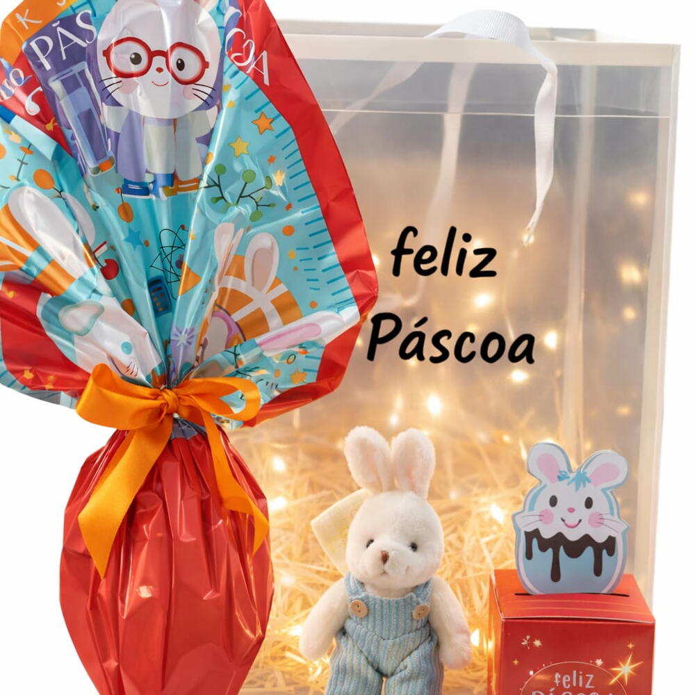 ovo de pascoa ao leite 250gr - 1 un. caixinha personalizada de bombom 100gr - 1 un. chaveiro coelho de pelucia - 1 un. sacola premium transparente - 1 un.