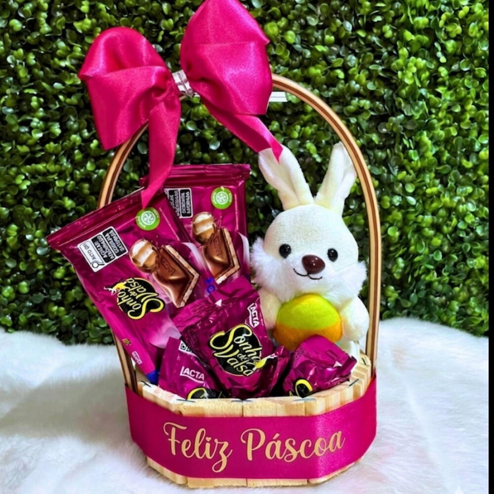 embalagem - 1 un. cesta - 1 un. barra sonho de valsa - 2 un. laço artesanal - 1 un. sonho de valsa bombom - 3 un. urso pelúcia coelho - 1 un.