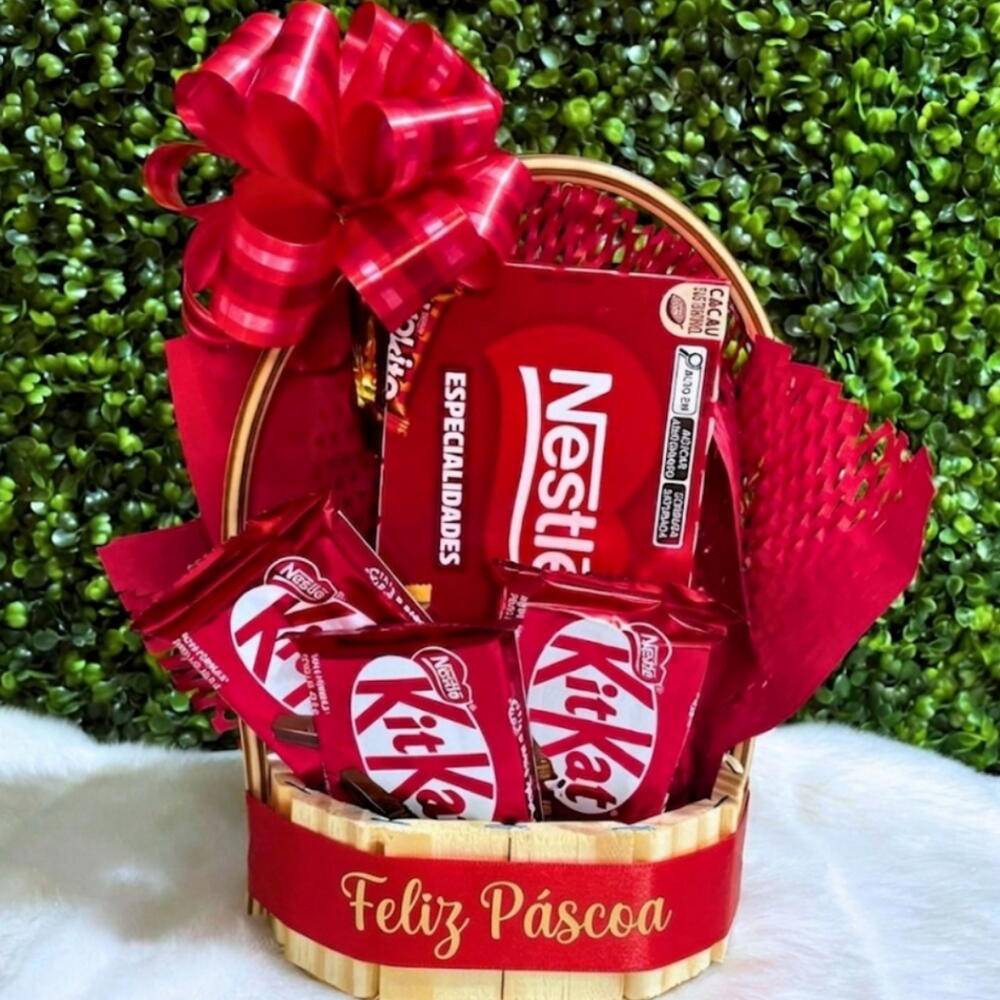 kit kat - 3 un. cesta - 1 un. caixa bombons nestlê - 1 un. enbalagem - 1 un. laço vermelho artesanal - 1 un.