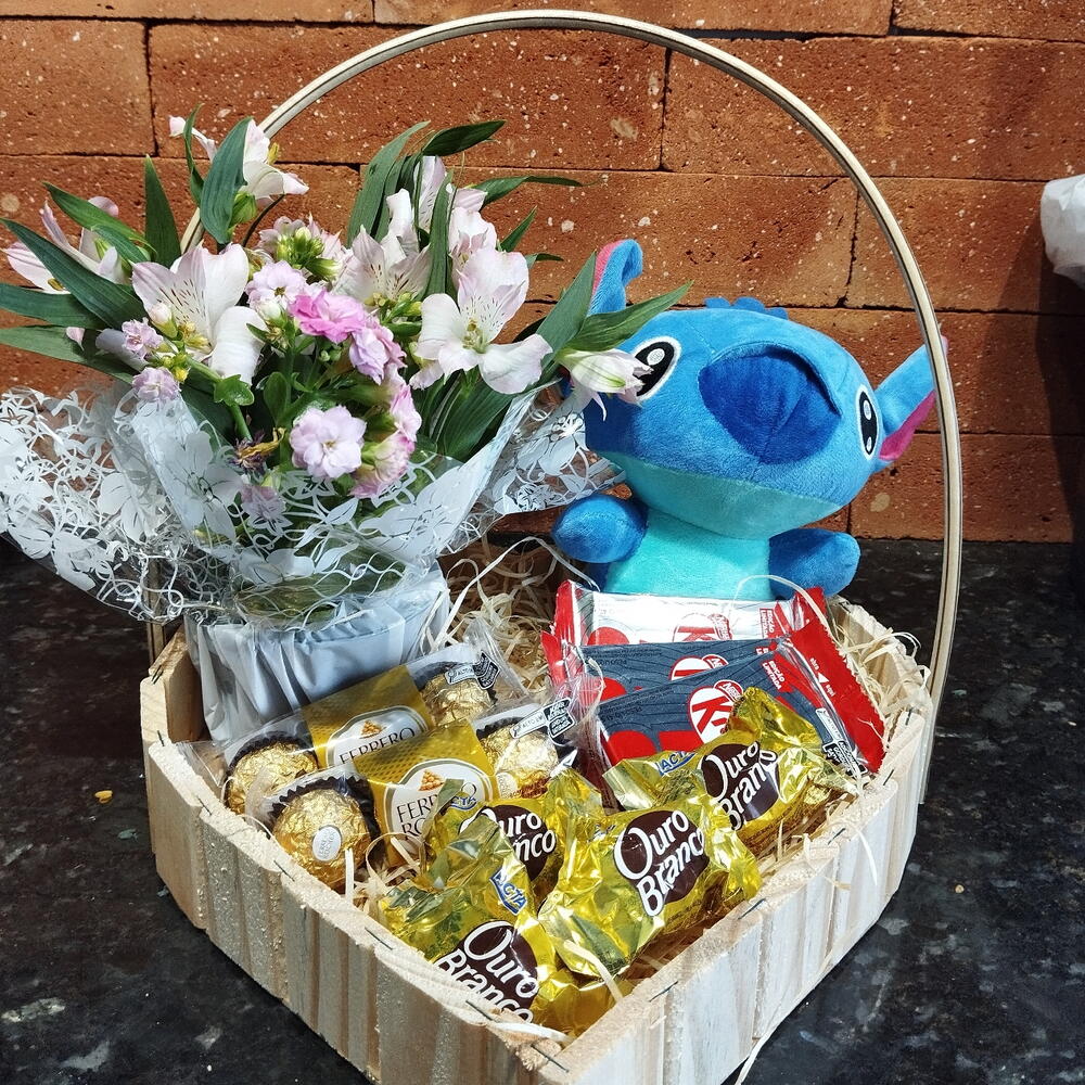 Apresentamos a você a nossa sofisticada Cesta de Chocolate! Repleta de delícias, esta cesta contém 3 unidades de Kit Kat crocantes e deliciosos; 5 bombons de chocolate irresistíveis; 1 flor Kaloches, não só para os olhos, mas também para o paladar; 2 caixas com 3 unidades de Ferrero Rocher, o toque perfeito de luxo; e finalmente, um encantador Stitch. Uma seleção de chocolates irresistível que fará o seu dia mais doce!