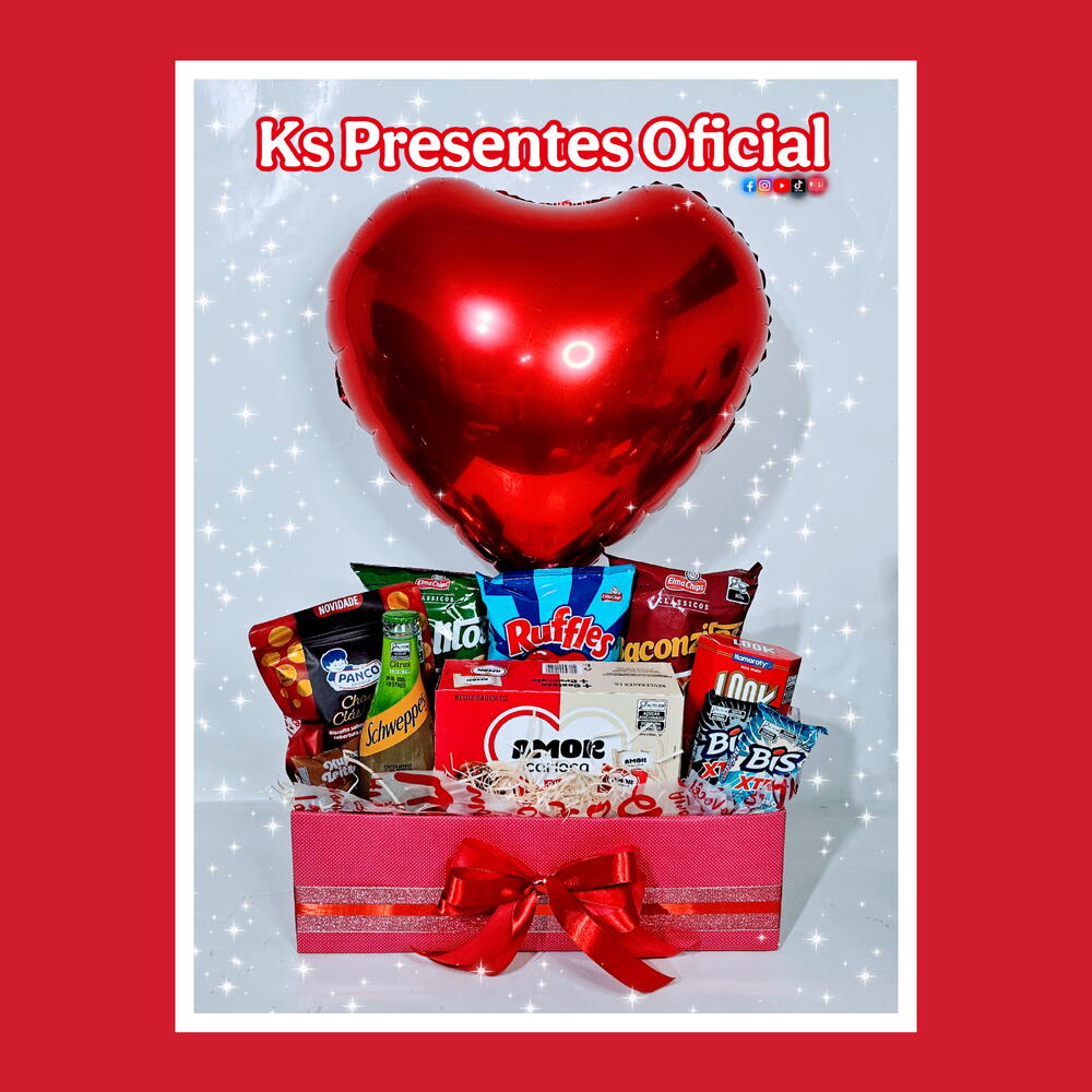 balão metalizado - 1 un. cesta personalizada - 1 un. caixa look - 1 un. bisnaga doce de leite - 1 un. pacote baconzitos - 1 un. barra bis xtra oreo - 1 un. barra bis xtra black - 1 un. pacote cebolitos - 1 un. pacote ruffles - 1 un. pacote choco panco premium - 1 un. caixa amor carioca duo - 1 un. schweppes long neck - 1 un.