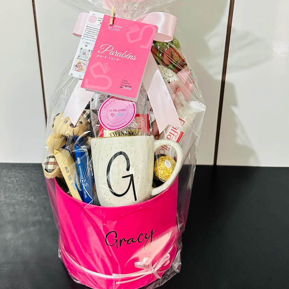 embalagem - 1 un. chocolates variados - 4 un. laço - 1 un. chá importado twinings ( sache) - 1 un. caixa personalizada - 1 un. arranjo flores naturais - 1 un. arranjo de flores naturais - 1 un. balão personalizado pequeno - 1 un. suco integral uva - 1 un. drip coffee café - 1 un. caneca personalizada a combinar - 1 un. chaveiro variado - 1 un.