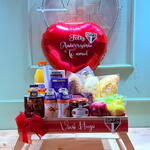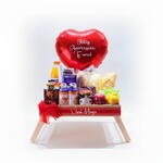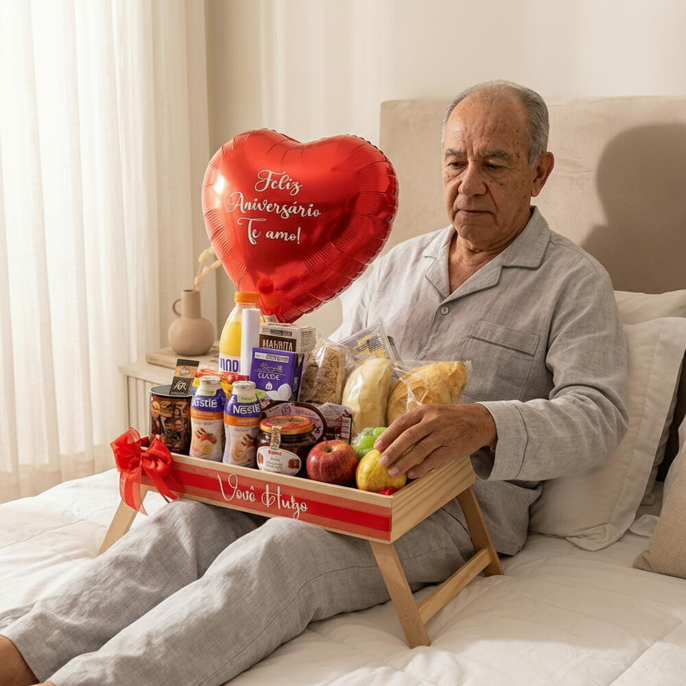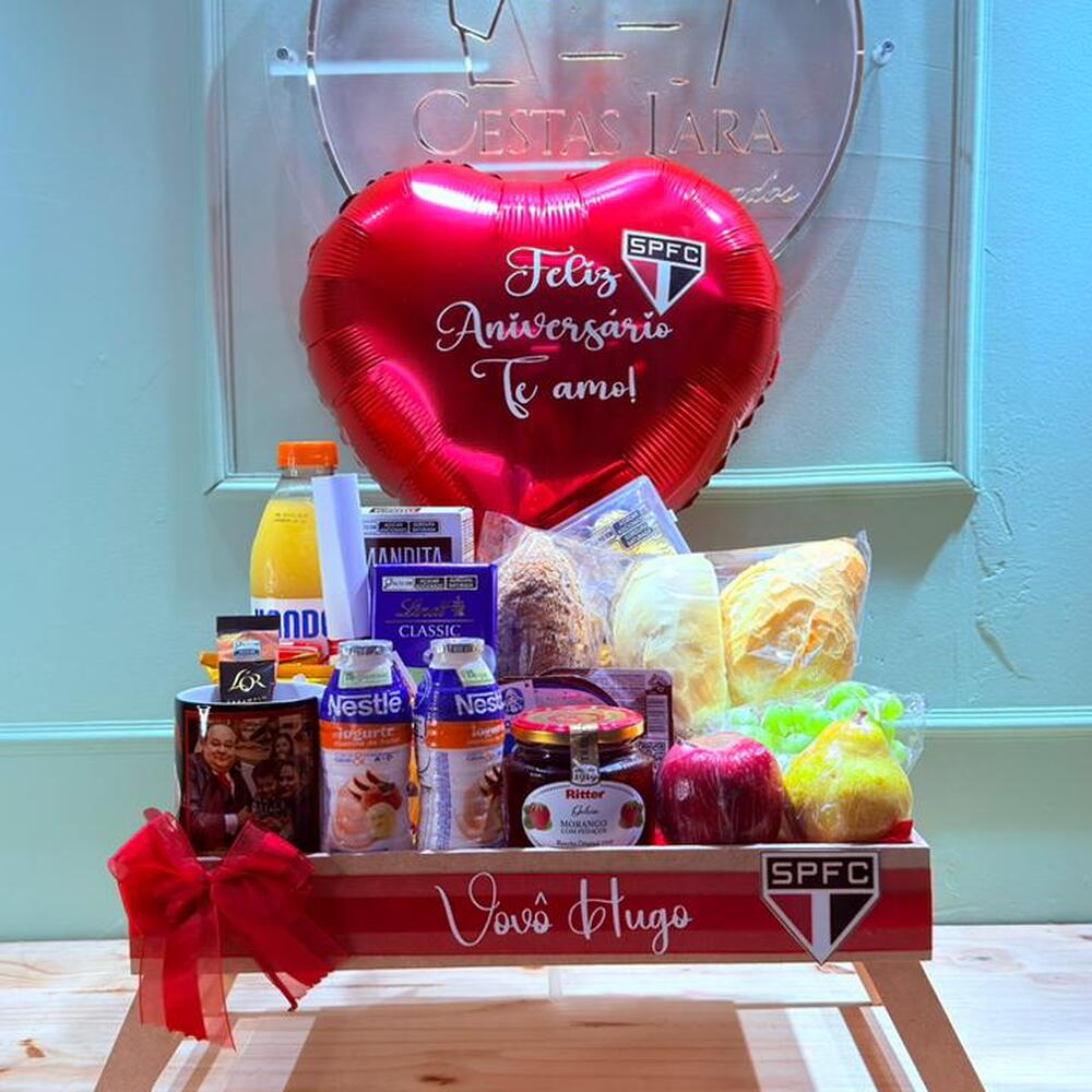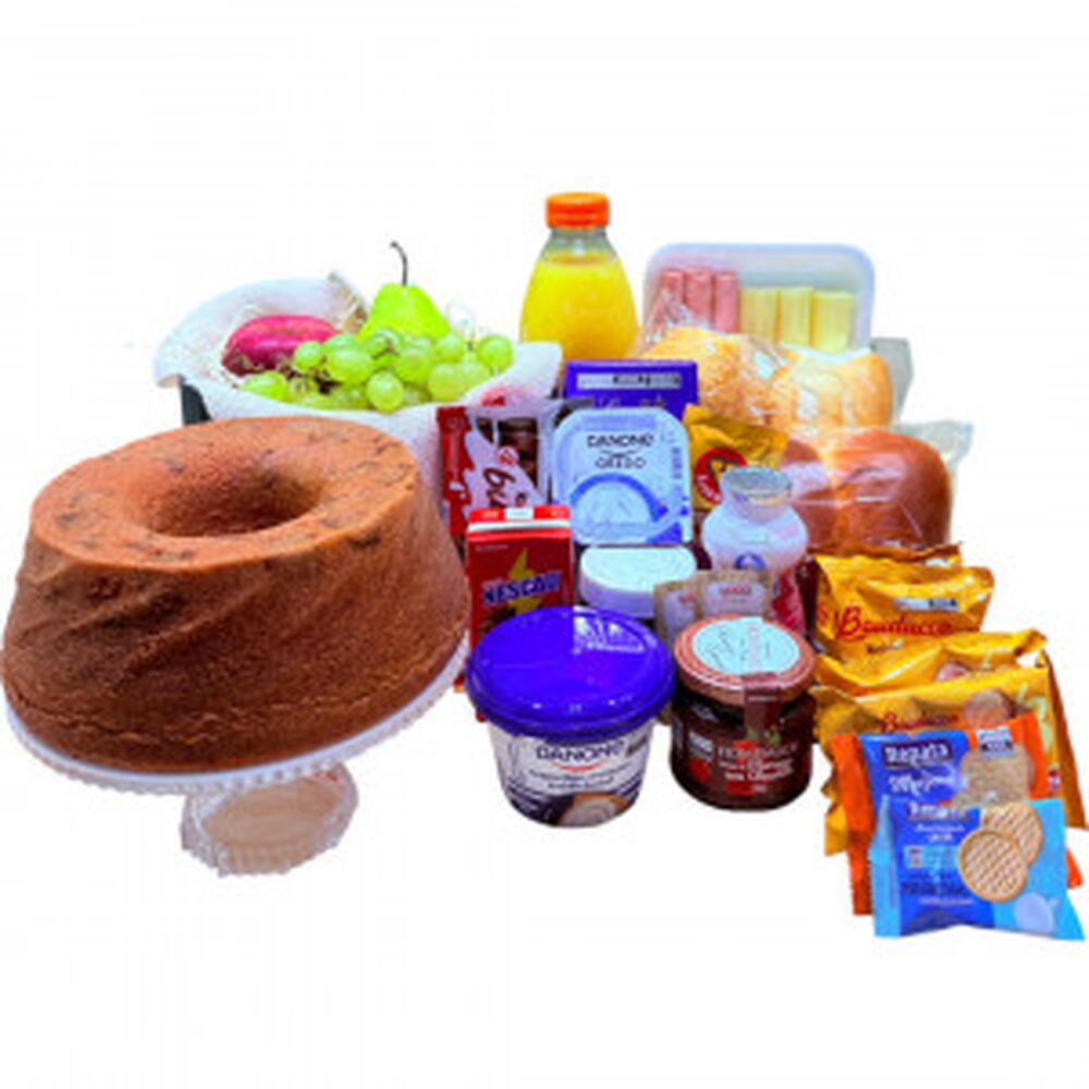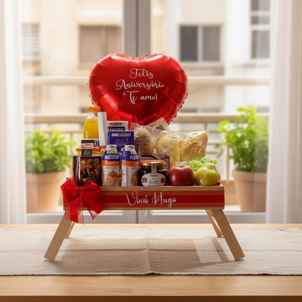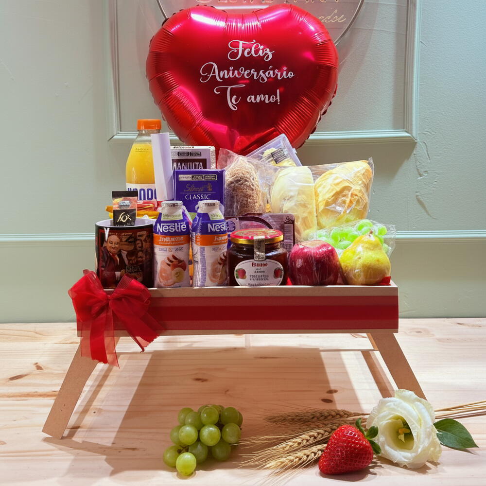 nutella - 1 un. chocolate lindt - 1 un. danone grego - 1 un. bolinhos bauducco - 2 un. iogurte de garrafinha - 2 un. bandeja pezinho mdf para viagem - 1 un. tipos de pães - 3 un. torradas bauducco - 2 un. sachê de açúcar - 1 un. suco de laranja 900 ml - 1 un. achocolatado 200 ml - 1 un. bolo caseiro - 1 un. caneca personalizada - 1 un. sachê cappuccino - 1 un. frios -mussarela - 1 un. frios -presunto - 1 un. requeijão cremoso - 1 un. geleia sabores - 1 un. tipos de uva - 3 un. chocolates kinder bueno - 2 un. balão bubble e dois corações - 1 un.