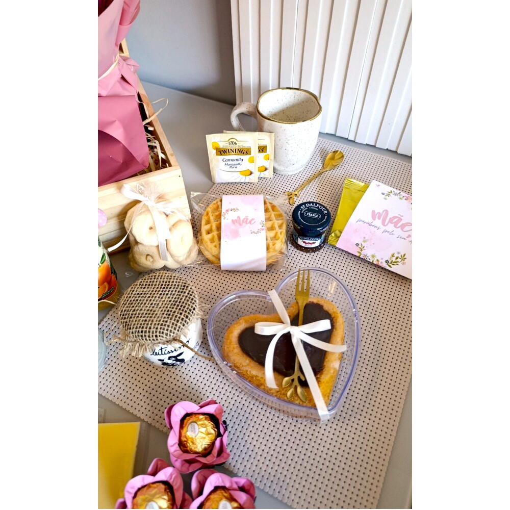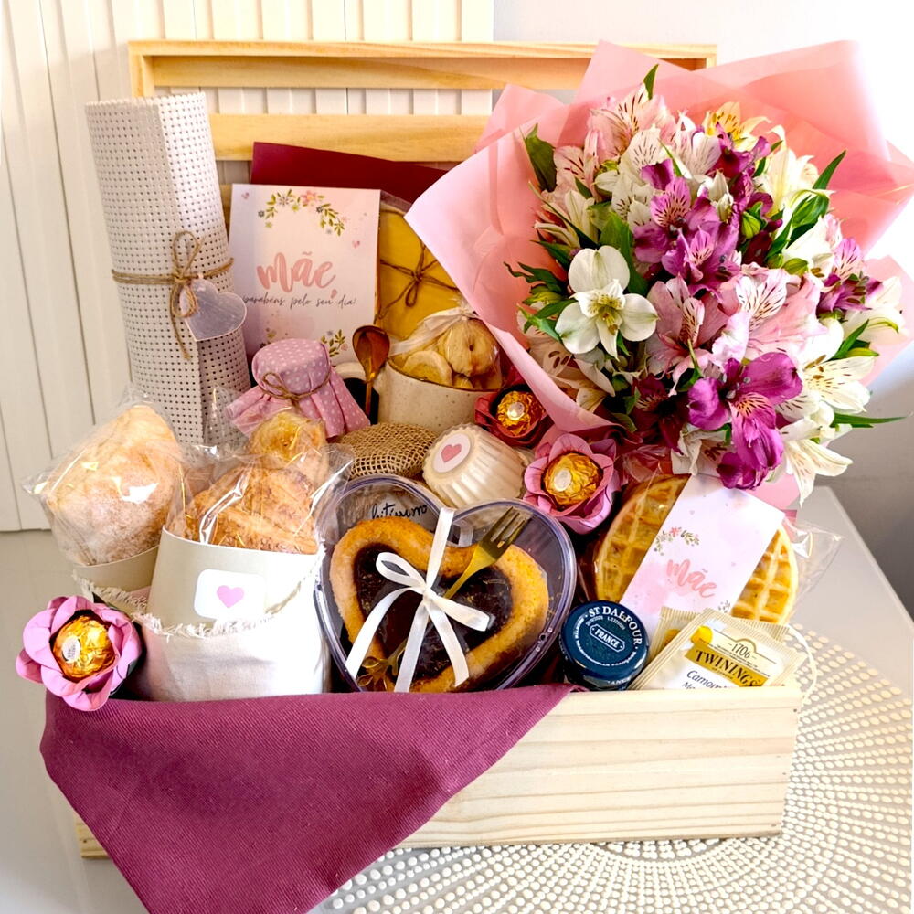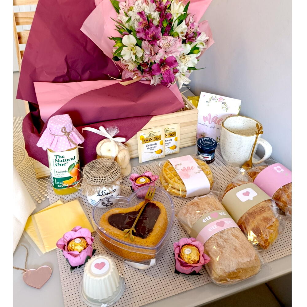 DESCRIÇÃO: Um presente completo e encantador para tornar o Dia das Mães ainda mais especial. Com uma seleção cuidadosamente escolhida de café da manhã, flores frescas e detalhes delicados, essa cesta é perfeita para surpreender com carinho, sabor e elegância logo nas primeiras horas do dia. COMPOSIÇÃO: Buquê de flores naturais (1un) Suco natural one (1un) Iogurte natural integral (1un) Croissant recheado (2un) Pão ciabatta (1un) Waffle (2un) Bolo de cenoura em formato de coração com cobertura de chocolate (1un) Garfo de sobremesa dourado (1un) Biscoitos amanteigados (1un) Bombons Ferrero Rocher na forminha de flor (3un) Queijo fatiado (2un) Queijo frescatino (1un) Mini geleia St Dalfour (1un) Cappuccino sachê (2un) Chá sachê (2un) Caneca oxford (1un) Colher inox de chá dourada (1un) Saquinho de pão em tecido (1un) Jogo americano (1un) Caixa de madeira (1un) Embalagem premium com laços e acabamento especial