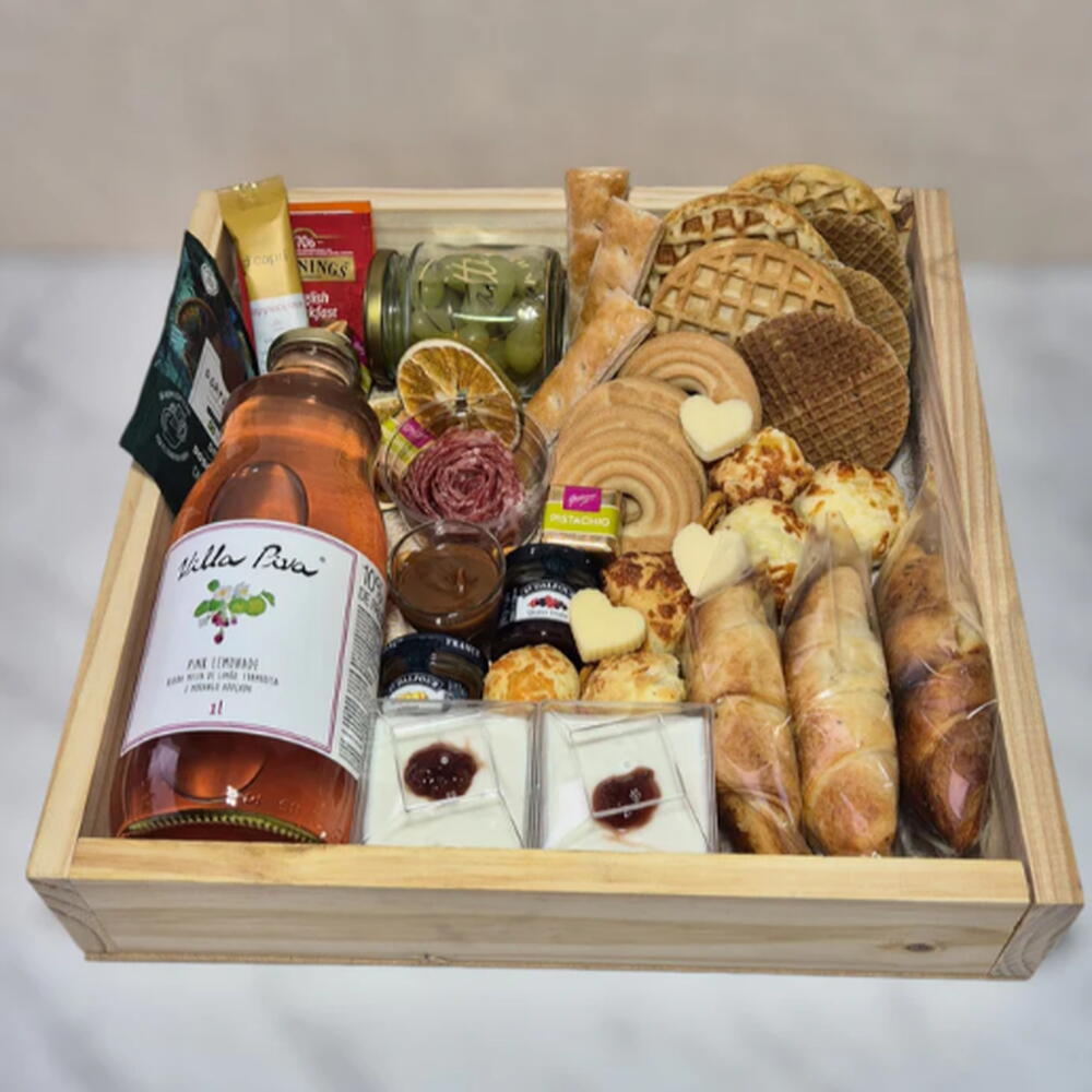 Uma celebração do convívio e da proximidade, pensada para transformar o café da manhã em um momento inesquecível em família. Esta imponente caixa de madeira reúne delícias cuidadosamente selecionadas, oferecendo mais do que sabores: é uma verdadeira experiência de aconchego e harmonia. Perfeita para ser compartilhada ao redor da mesa, ela convida a momentos de conexão, risos e carinho, onde cada item é um convite para fortalecer os laços e criar memórias especiais no início de cada dia. Serve de 3 a 4 pessoas; Caixa de Madeira pinus ou caixa redonda em MDF contendo: Croissants recheados, Pães de queijo, Flor de salame, Biscoitos importados folhados e baunilha, doce de leite argentino no copinho de vidro, Iogurte natural com um toque de geleia importada, torradinhas slim toast, Uvas, Chá importado Twinings, Drip Coffee, Suco integral 1 litro, Stroopwaffel, mini pretzels, Bombons recheados, Geleia francesa St. Dalfour. Os momentos mais preciosos são aqueles compartilhados à mesa com os que fazem a nossa história, um gesto de carinho que tornará o dia especial celebrando a conexão e o calor da família.