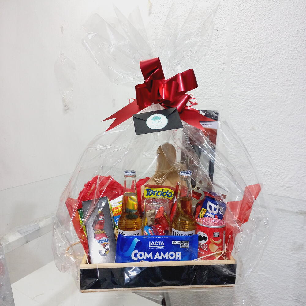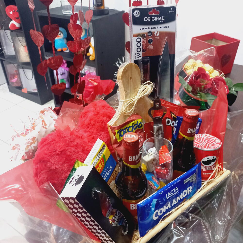 torcida - 1 un. doritos - 1 un. amendoim - 1 un. chocolate bis - 1 un. pipoca de microondas - 1 un. cesta de pinus decorada - 1 un. pelúcia coração ( pode variar ) - 1 un. abridor de cerveja - 1 un. batata pingles - 1 un. tábua de corte - 1 un. kit para churrasco - 1 un. chocolate barra 80g - 1 un. cerveja brahma longnek - 2 un. uma tulipa de vidro - 1 un.