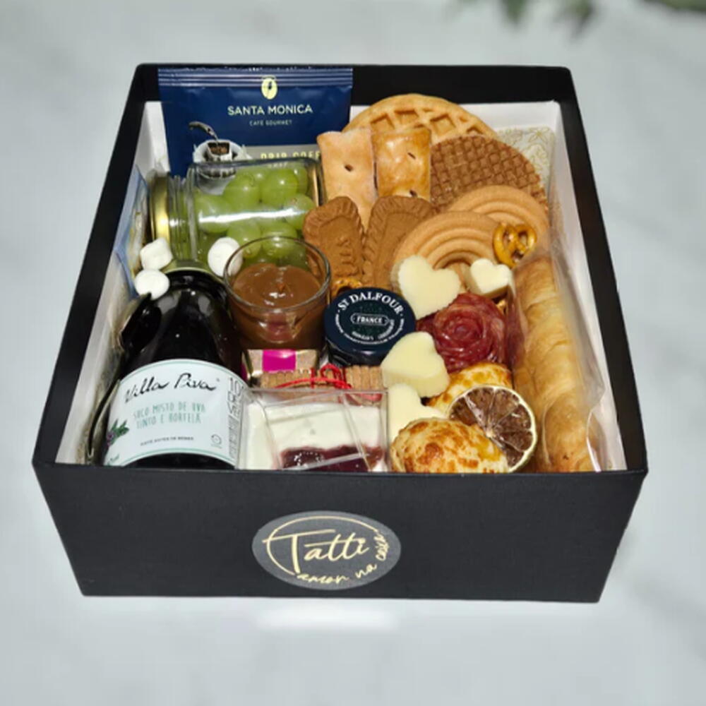 O requinte em cada detalhe da cesta Premium Santiago é guardado em uma elegante caixa cartonada com tampa transparente, ao abrir revela-se uma agradável surpresa onde os mais finos sabores elevam o despertar matinal a uma experiência inesquecível. Elegante caixa cartonada 25x22cm contendo: Croissant recheado, pães de queijo, flor de salame, queijo, variados biscoitos folhados e amanteigados, biscoito lotus, doce de leite argentino, mini geleia, iogurte grego com toque de geleia italiana, torradinhas, fruta, chá importado twinings, drip coffee (sachê de café individual para coar), suco integral na garrafa de vidro, stroopwafel, mini pretzels, bombom.