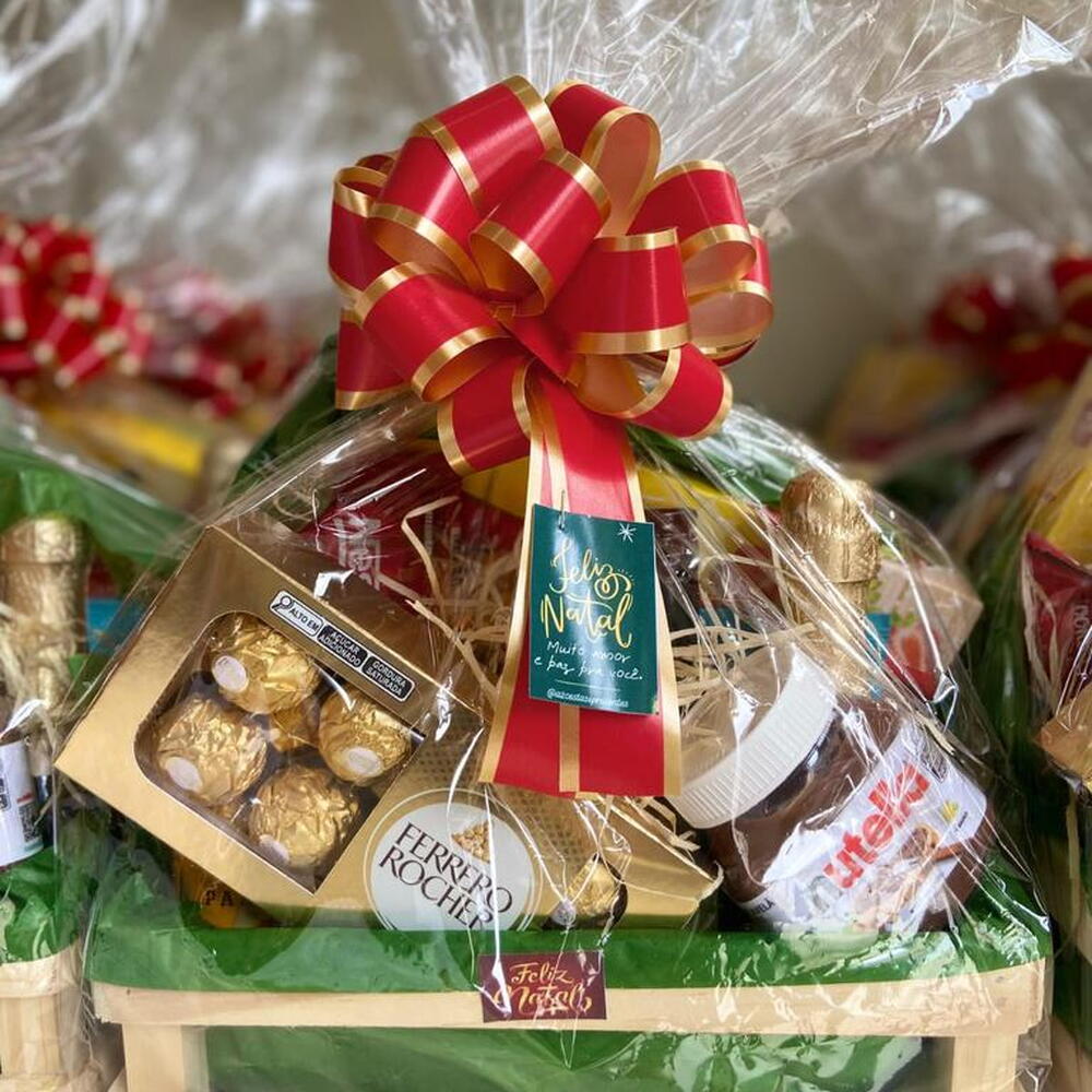 nutella - 1 un. ferrero rocher - 1 un. barra de chocolate alpino - 1 un. cookies - 1 un. amendoim - 1 un. caixote de madeira - 1 un. castanhas - 1 un. mini chandom - 1 un. biscoito champanhe - 1 un. embalagemdecoração - 1 un. mini vinho morgado - 1 un. mini panetonne - 1 un.