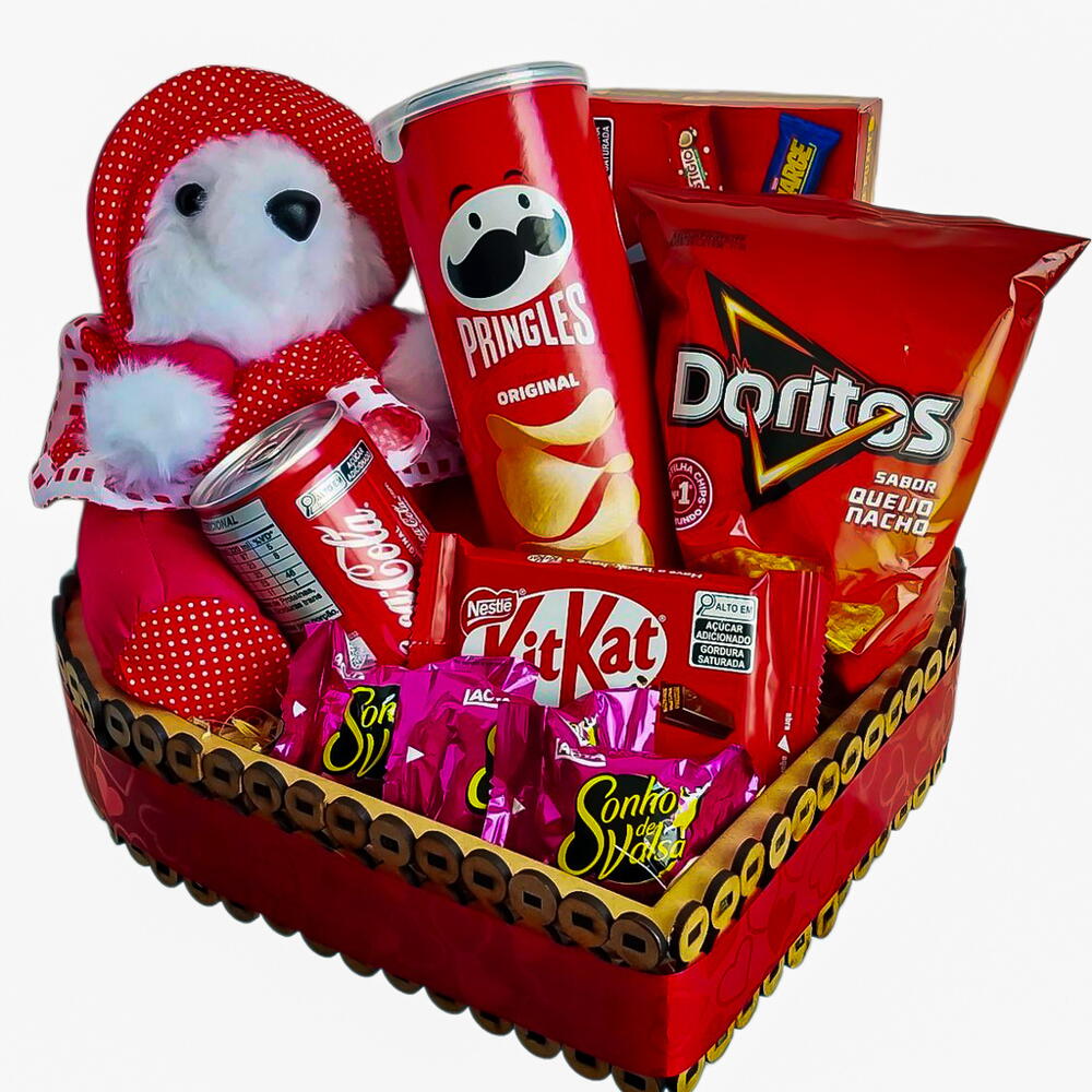 kit kat - 1 un. bombons - 4 un. caixa de bombom - 1 un. doritos - 1 un. coca cola - 1 un. cesta de coração - 1 un. prigles - 1 un. kit embalagem - 1 un.