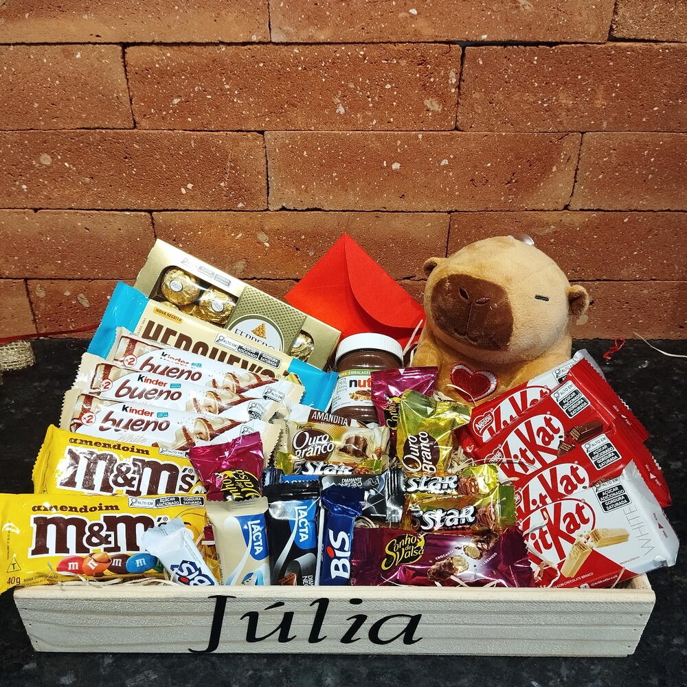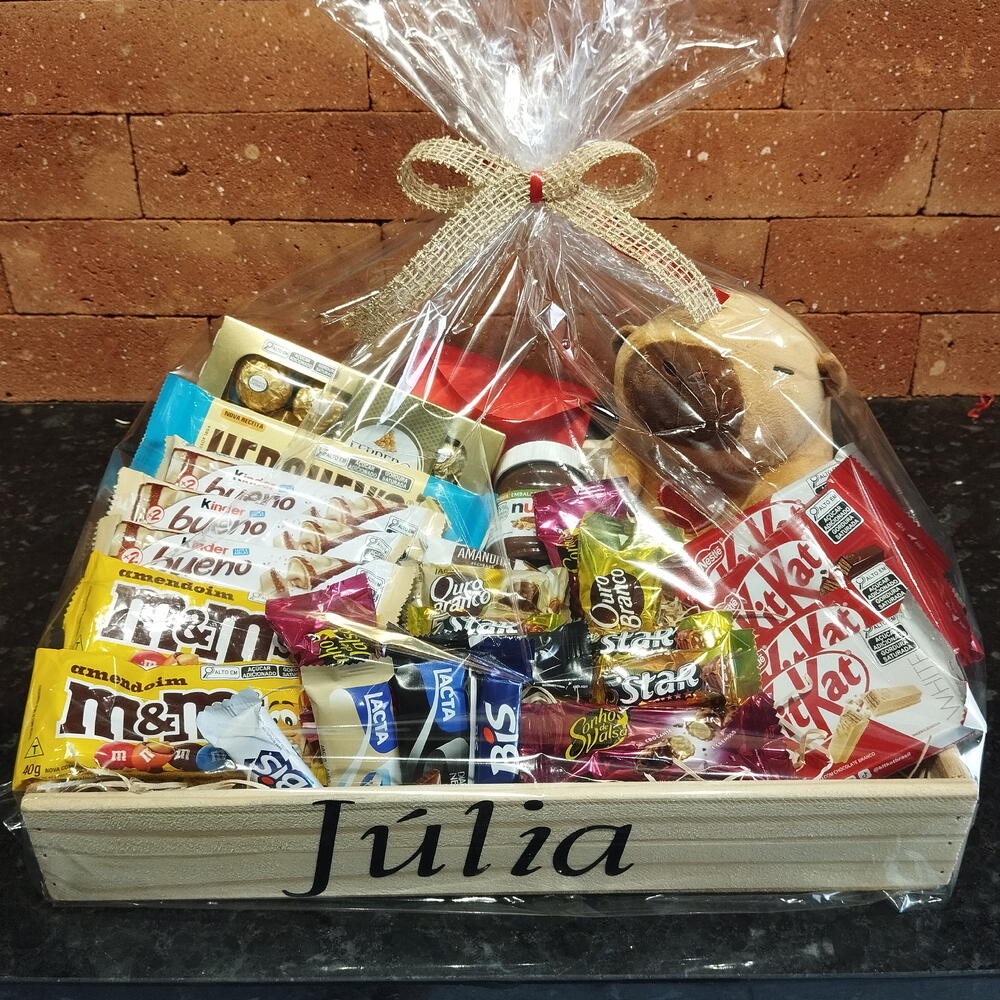 barra de chocolate - 1 un. ferrero rocher 8 unidades - 1 un. nutella - 1 un. pelúcia - 1 un. kit kat - 4 un. bombons sortidos - 8 un. kinder bueno - 3 un. mms chocolate 45g - 2 un. bandeja com nome do presenteado (enviar via chat o nome) - 1 un. kit embalagem com laço personalizado e saco transparente - 1 un.