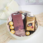 Esta encantadora cesta de chocolate é uma combinação perfeita de elegância e sabor. A cesta é decorada com uma delicada fita de cetim, e vem recheada com uma seleção de doces requintados: Quatro bombons Ferrero Rocher, uma barra de chocolate premium Nugali, uma caixa de bombons suíços Lindt e uma barra Ferrero Rocher premium. Também inclui um cartão de mensagem fino para expressar seus sentimentos e uma tag de acrílico em formato de coração para adicionar um toque pessoal. Tudo isto é elegantemente apresentado numa caixa cartonada fina com forração em tecido de cetim. Uma escolha ideal para presentear em qualquer ocasião.