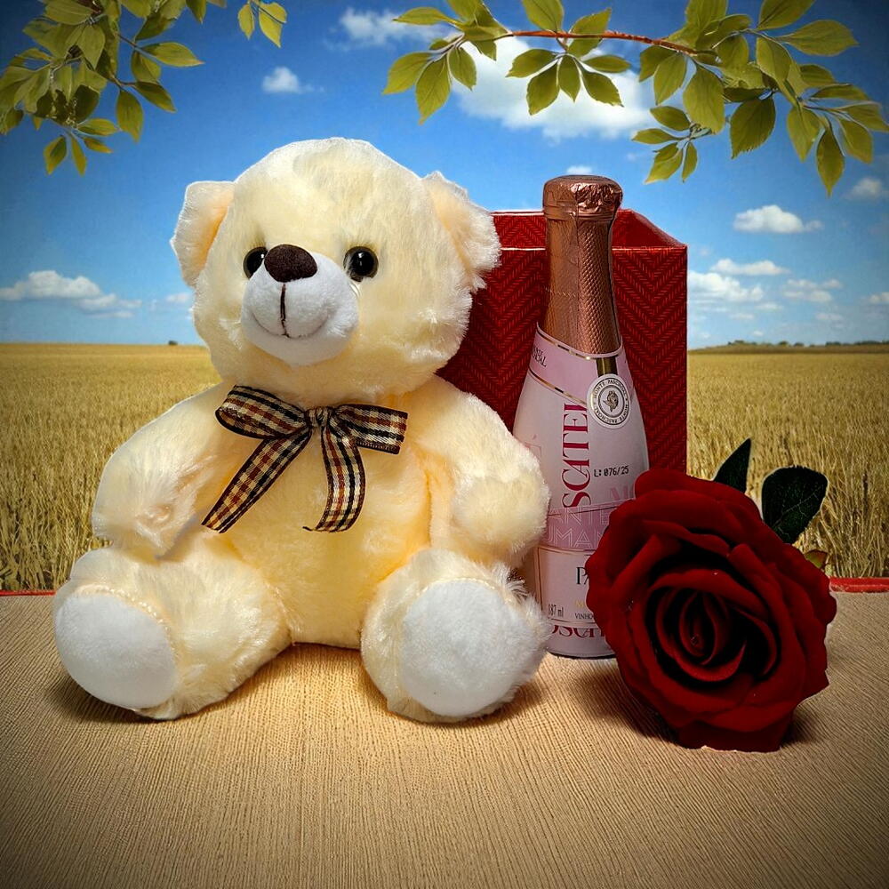 Este conjuntinho elegante é o presente perfeito para ocasiões especiais. Contém uma bela rosa artificial que nunca murcha, um ursinho de pelúcia fofinho que traz um sorriso no rosto de qualquer um, um fino vinho moscatel rosé espumante Monte Paschoal que adiciona um toque de luxo e sofisticação, tudo cuidadosamente embalado numa caixa de cartonagem elegante. Embrulhado com celofane e terminado com um laço delicado, este presente é uma maneira carinhosa de expressar seu amor e apreço.