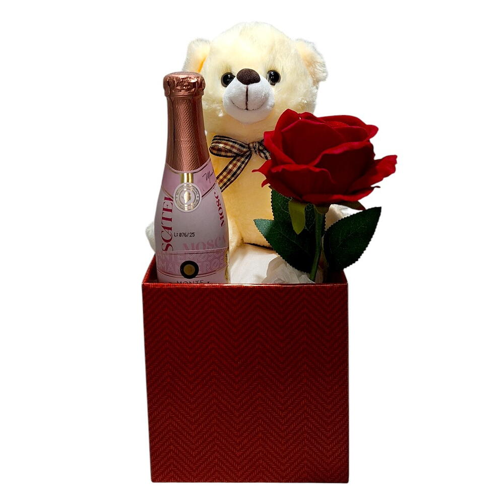 urso de pelúcia - 1 un. rosa artificial - 1 un. caixa cartonagem - 1 un. vinho moscatel espumante rose monte paschoal 187 ml - 1 un. celofane + laço - 1 un.