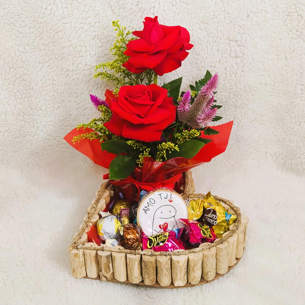 Cesta Romântica Rustica Media Formato Coração com Arranjo 2 Rosas e Chocolates