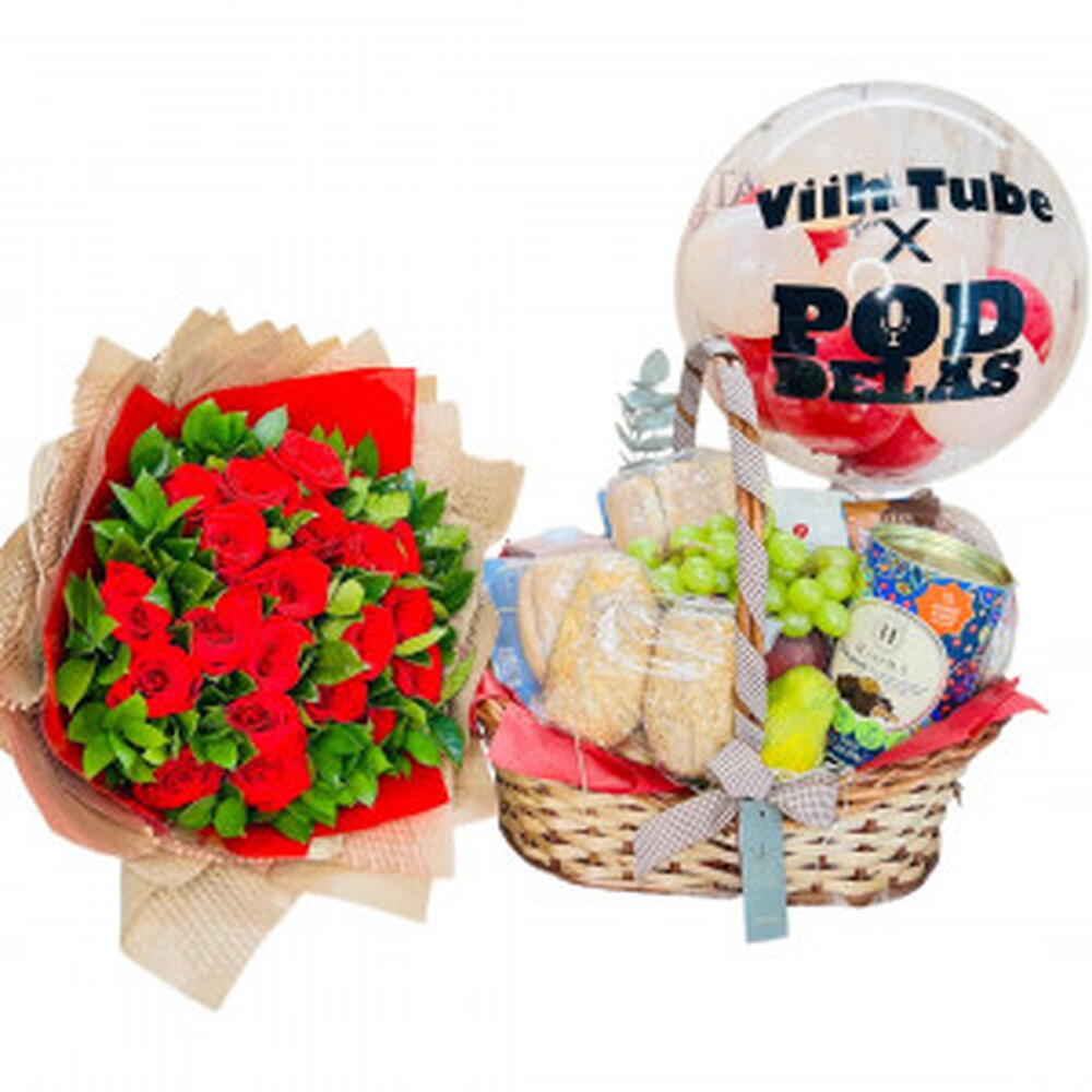 frutas -pera - 1 un. frutas -maça - 1 un. tipos de pães zero glúten - 2 un. sachê de café gourmet bagio - 1 un. frutas -uvas - 1 un. chocolate haoma - 1 un. chocolate zero - 1 un. suco villa piva - 1 un. buquê de rosa colombianas 30 rosa - 1 un.