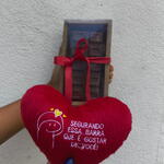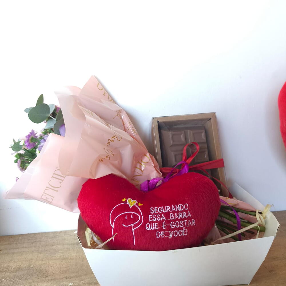 buquê mix de flores - 1 un. barra de chocolate recheada sabor beijinho 470 gramas - 1 un. almofadinha com dizer - 1 un.