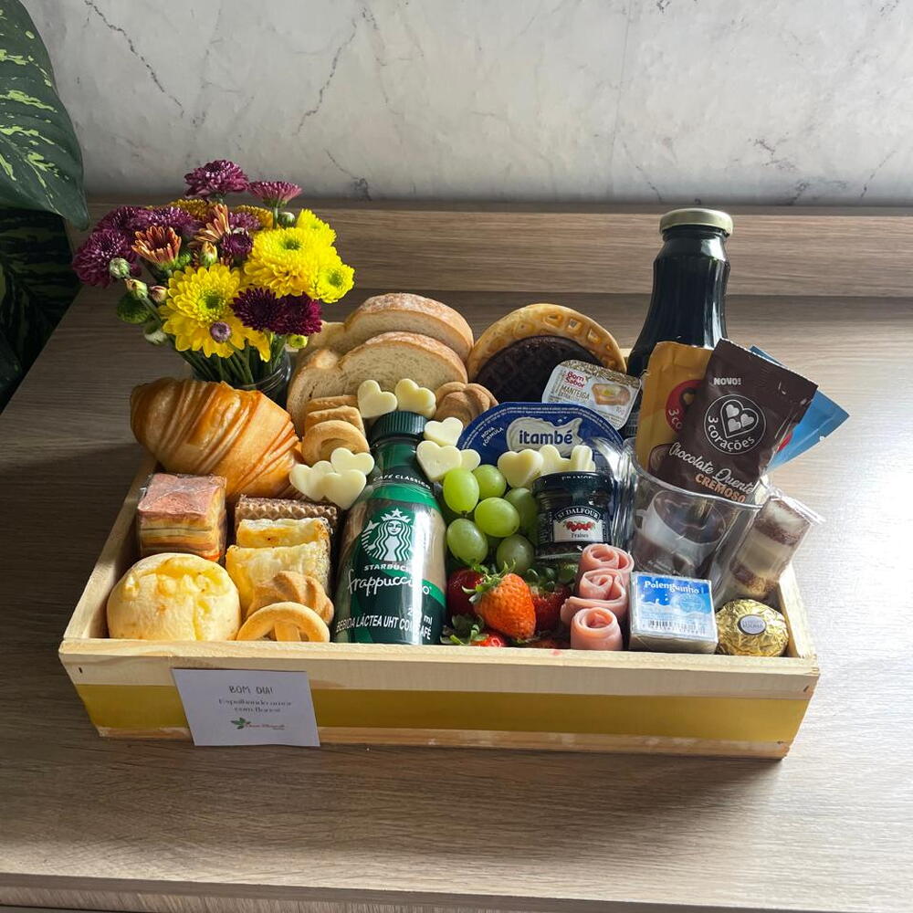 biscoitos amanteigados - 1 un. pão de queijo - 1 un. iogurte grego - 1 un. café com leite (sache) - 1 un. capuccino (sache) - 1 un. suco integral de uva - 1 un. porção de morangos - 1 un. hanuta - 1 un. xícara - 1 un. capuccino starbucks - 1 un. presunto fatias - 3 un. pollenguinho - 1 un. blister manteiga - 1 un. porcao de uvas verdes - 1 un. kinder bueno chocolate - 1 un. croinsant - 1 un. mini buquê mix. - 1 un. pão de queijo formato de waflle - 1 un. torradas super finas coloridas - 1 un. porção de mussarela formato coração - 1 un. geleia saint dalfour pequena - 1 un. ferrero rocher 1 unidade - 1 un. pão artesanal fatias - 2 un. folhado de frango - 3 un. waflle de chocolate - 1 un. chocolate quente cremoso (sachê) - 1 un.