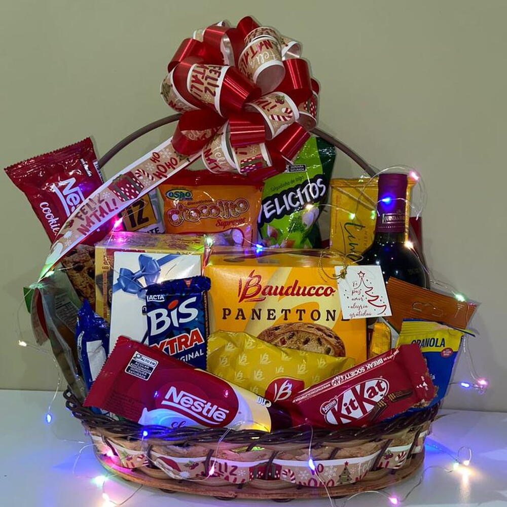 barra de chocolate - 1 un. caixa de chocolate - 1 un. kit kat - 1 un. cookies - 1 un. waffer - 1 un. biscoito oreo - 1 un. amendoim - 1 un. granola - 1 un. bis extra - 1 un. cesta de palha - 1 un. paçoquita - 1 un. castanha - 1 un. azeitona - 1 un. trufas de chocolate - 1 un. sequilhos - 1 un. panetone - 400 gr. aperitivo salgado - 1 un. embalagemdecoração - 1 un. vinho ou sidra - 1 un.