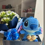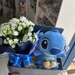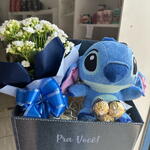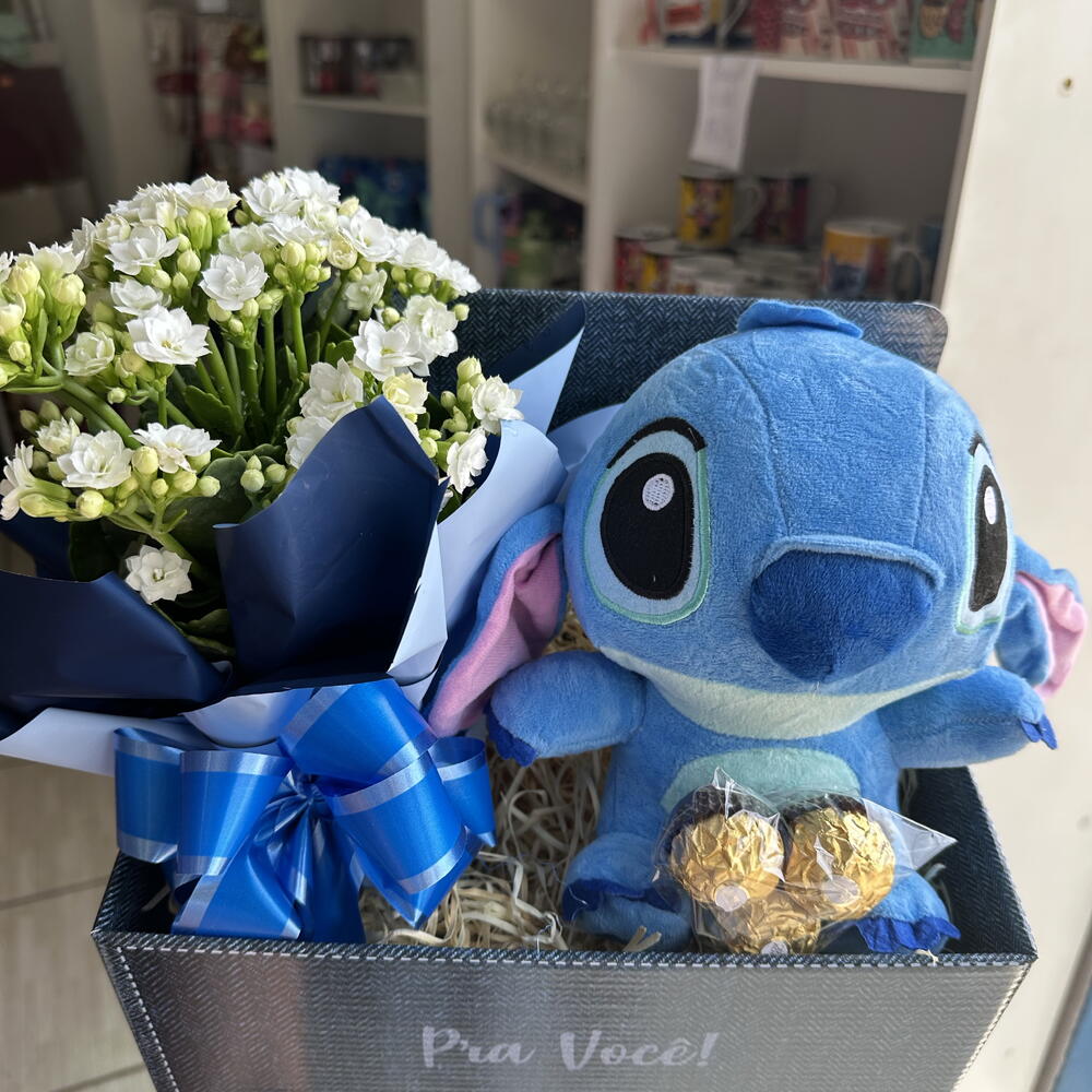 celofane - 1 un. ferrero rocher - 3 un. kalanchoe - 1 un. caixa papelão decorada - 1 un. laço para decoração - 1 un. pelúcia stitch 25 cm - 1 un.