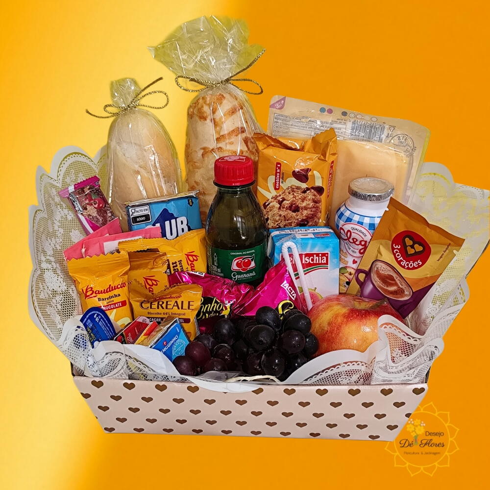 iogurte - 1 un. maçã - 1 un. bombons sonho de valsa - 2 un. torrada bauducco - 1 un. cookies - 1 un. geleia - 1 un. chá - 1 un. margarina - 1 un. mel - 1 un. uvas - 1 un. pães - 2 un. açúcar - 1 un. barra de cereais - 1 un. clube social - 1 un. nucita - 1 un. queijo prato - 1 un. suco caixa 200ml - 1 un. cesta bandeja tam p - 1 un. guaranazinho ou suquinho del vale - 1 un. biscoitinhos sortidos - 3 un.