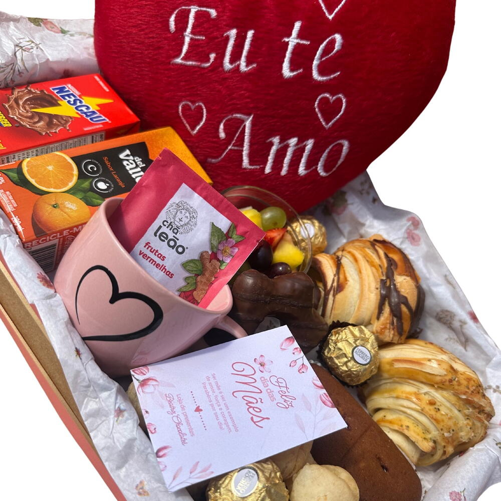 cartão personalizado - 1 un. caneca - 1 un. ferrero rocher - 3 un. laço - 1 un. pão de mel - 1 un. bolinho - 1 un. chá - 1 un. pelúcia de coração - 1 un. croissant de chocolate - 1 un. nescau - 1 un. embalagem celofane - 1 un. suco del valle - 1 un. bandeja de mdf decorada - 1 un. 100 gramas de pão de queijo - 1 un. croissant de preseunto e queijo - 1 un. salada de frutas dentro do potinho de vidro - 1 un.