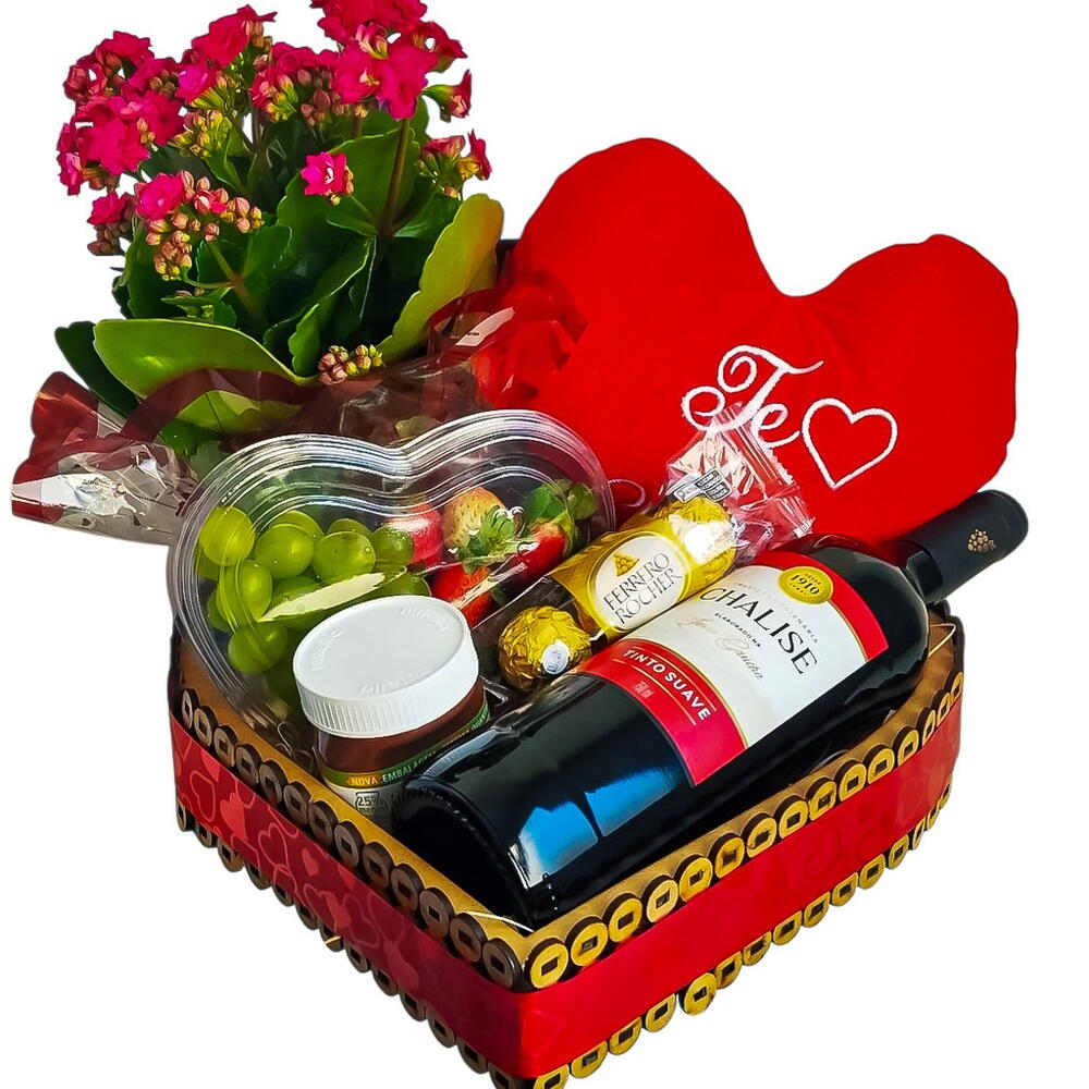 vinho - 1 un. nutella - 1 un. flor - 1 un. coração de pelucia - 1 un. ferrero rocher 3 unidades - 1 un. cesta de coração - 1 un. kit embalagem - 1 un. pote de coração uva e morango - 1 un.