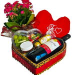 Este presente magnífico é o epítome do romance e ternura, perfeito para ocasiões especiais. Começa com uma garrafa de vinho requintado, para apreciar a dois num momento de calma. Próximo, temos um coração de pelúcia, fofo ao toque e a flor adiciona uma pitada de paixão natural. O pote de coração uva e morango é toda a doçura que você precisa para demonstrar o quanto ama. Acrescentamos ainda o irresistível Ferrero Rocher em três unidades, e uma deliciosa Nutella para adicionar um sabor rico ao seu momento. Para dar o toque final, todos estes itens encantadores são colocados numa elegante cesta em forma de coração e numa embalagem especialmente projetada para este kit. Uma ode ao amor em uma única cesta! Produto 4007