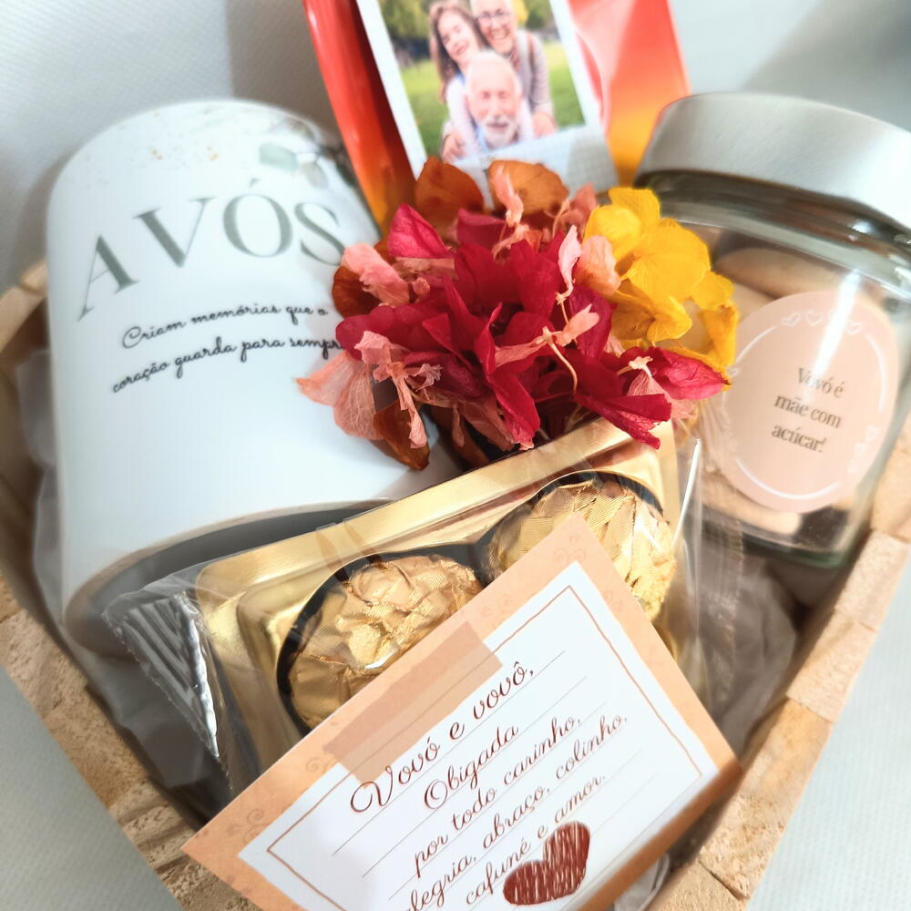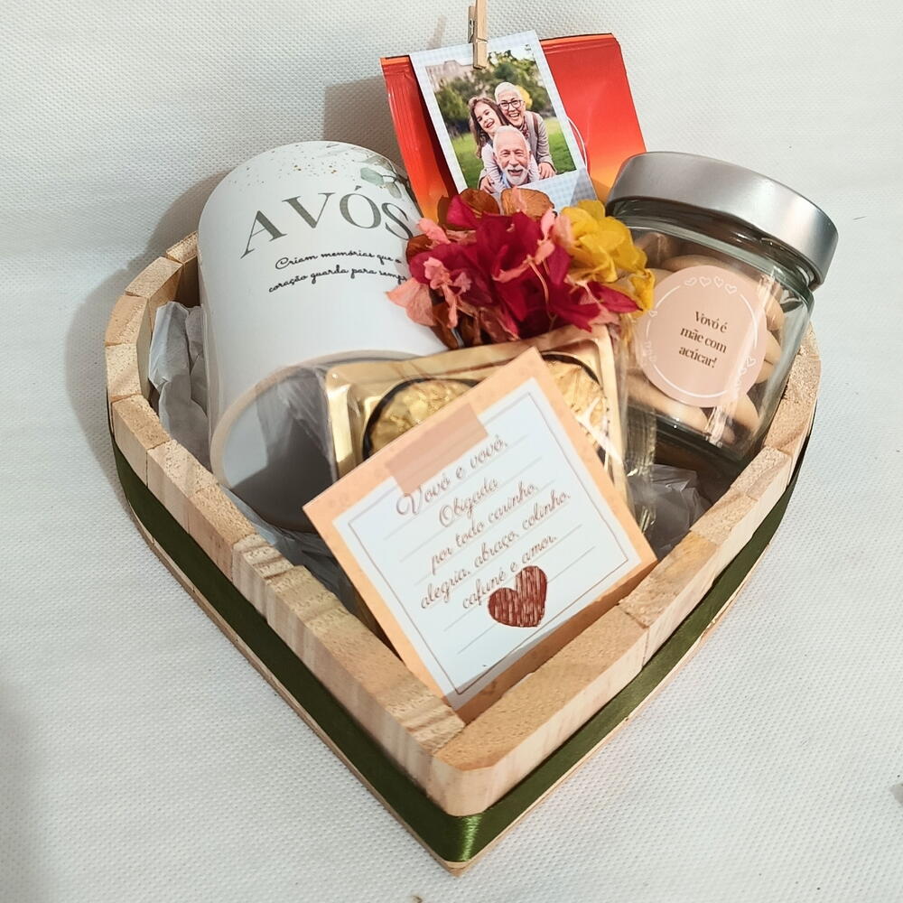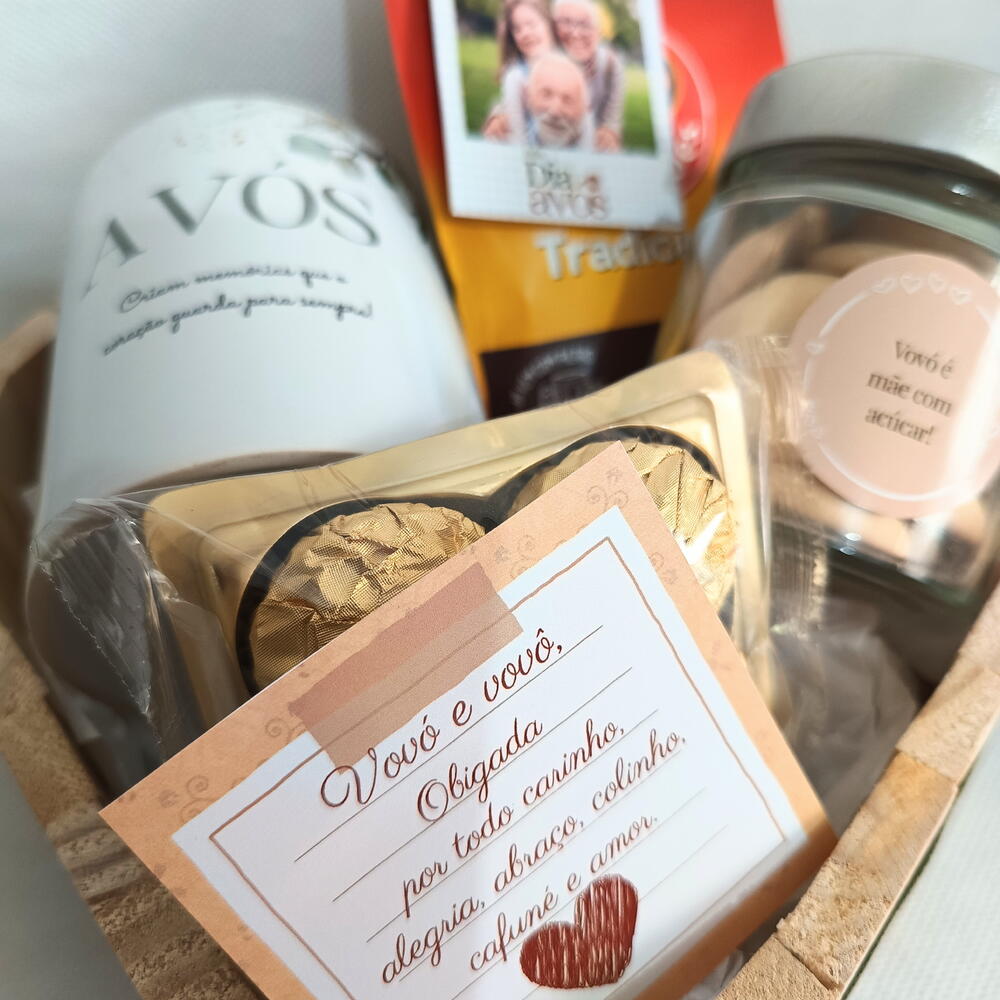 foto polaroid - 1 un. dreep café - 1 un. cartão de mensagem (enviar via chat) - 1 un. buquê de flores naturais desidratadas. - 1 un. ferrero rocher com 4 - 1 un. bandeja de pinus formato coração - 1 un. caneca de cerâmica dia dos avós - 1 un. pote de vidro com sequilhos - 1 un.