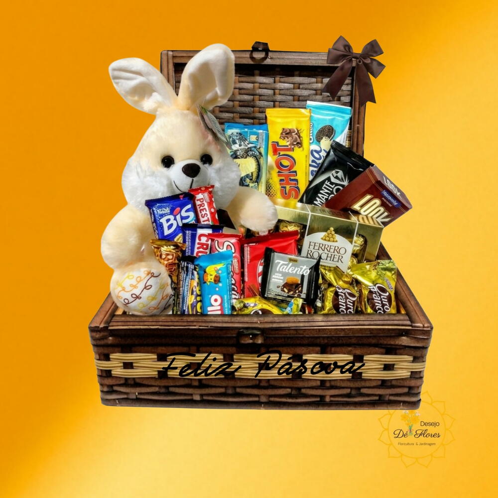 Uma Páscoa Recheada de Emoção 🐰🧺 Quer entregar uma experiência completa de presente? A nossa cesta Tesouros de Páscoa foi montada pensando em cada detalhe da surpresa. O Visual: Um baú de vime clássico, decorado e reutilizável (perfeito para decorar a casa depois). O Recheio: Uma seleção generosa com as marcas mais amadas (Ferrero, KitKat, Ouro Branco, Diamante Negro e outros). A Ternura: Uma pelúcia exclusiva de coelhinho que torna o momento inesquecível. Surpreenda com abundância e bom gosto. Peça o seu agora e garanta a entrega! 🛵✨