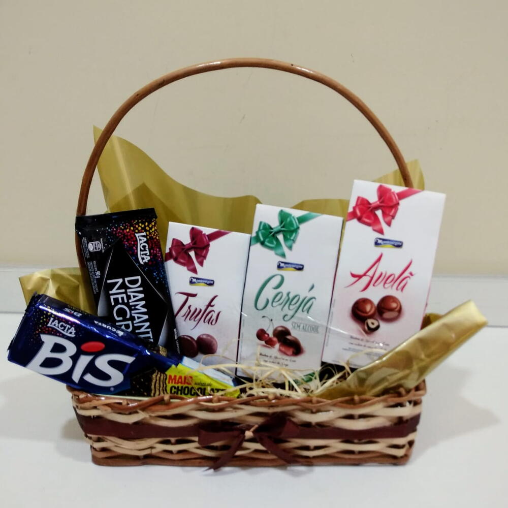 Este irresistível Cesta de Chocolate é composta por uma variedade de delícias. Dentro você encontrará 3 caixas de trufas saborosas e variadas, uma unidade da irresistível Bis e uma unidade do luxuoso chocolate Diamente Negro. Uma combinação perfeita para os verdadeiros amantes de chocolate!