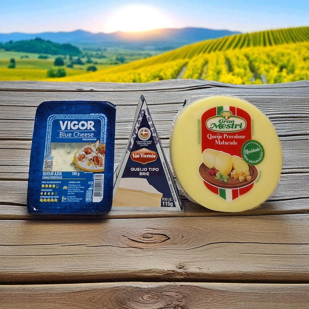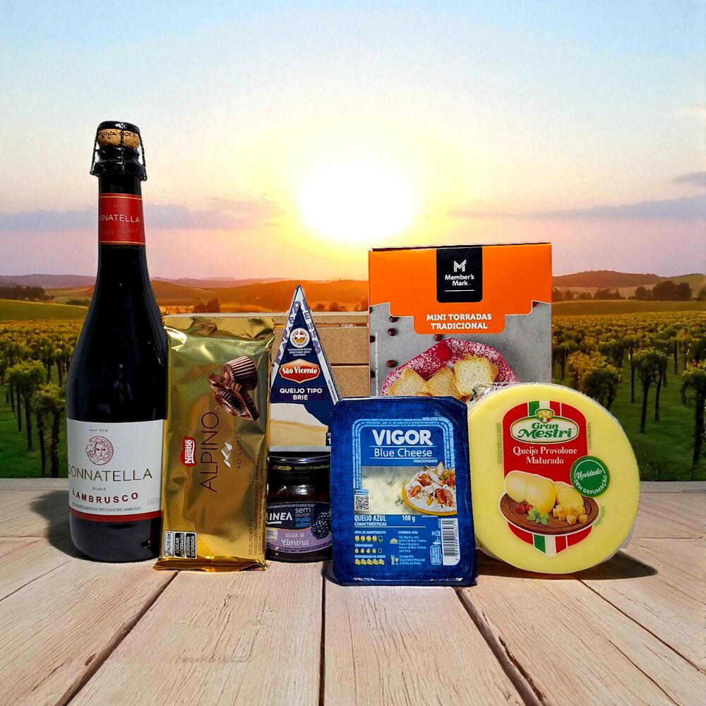 caixa de mdf - 1 un. queijo tipo gorgonzola 100 g - 1 un. queijo tipo brie 115 g - 1 un. chocolate alpino ao leite 85 g nestle - 1 un. vinho frisante tinto lambrusco suave fino donnatella 660 ml goes - 1 un. geleia de amora linea 230 g - 1 un. queijo tipo provolone maturado 215 g - 1 un. celofane + laço - 1 un. pacote de mini torradas portuguesa 120 g - 1 un.