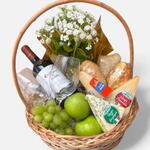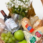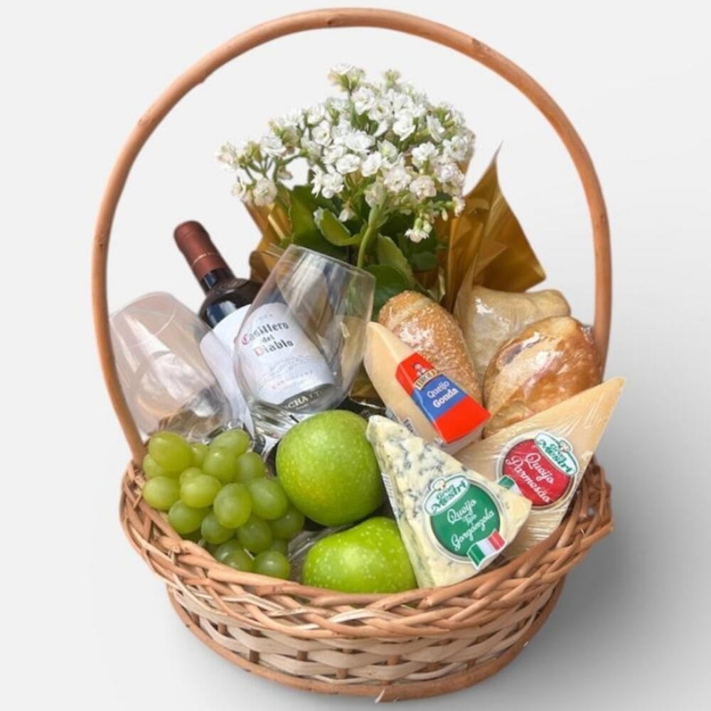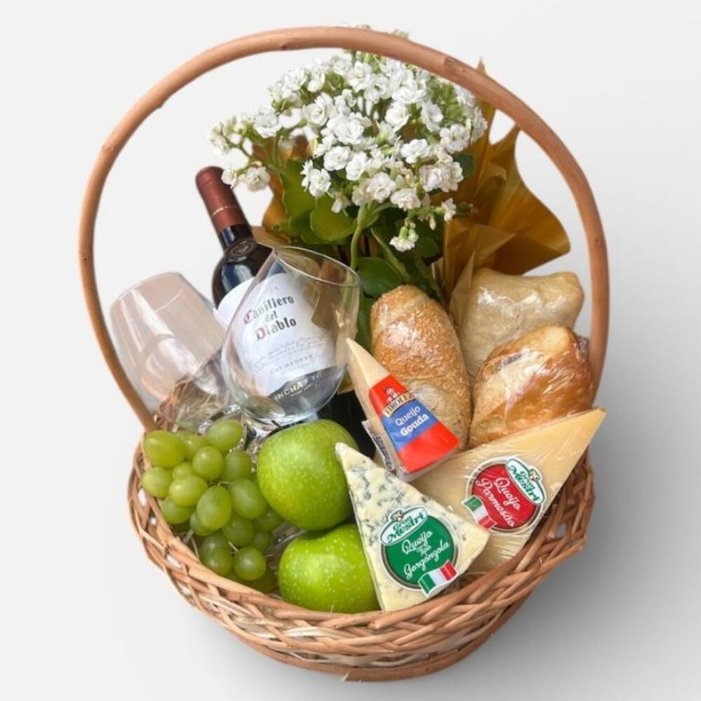 taça de vidro - 2 un. queijo parmesão - 1 un. maçã verde - 2 un. queijo gorgonzola - 1 un. vinho casillero del diablo - 1 un. laço especial - 1 un. cacho de uvas sem sementes - 1 un. baguete parmesão especial - 1 un. celofane embalagem - 1 un. queijo gouda ou brie - 1 un. pão italiano especial - 1 un. pão ciabata especial - 1 un. flor da fortuna no vasinho - 1 un.