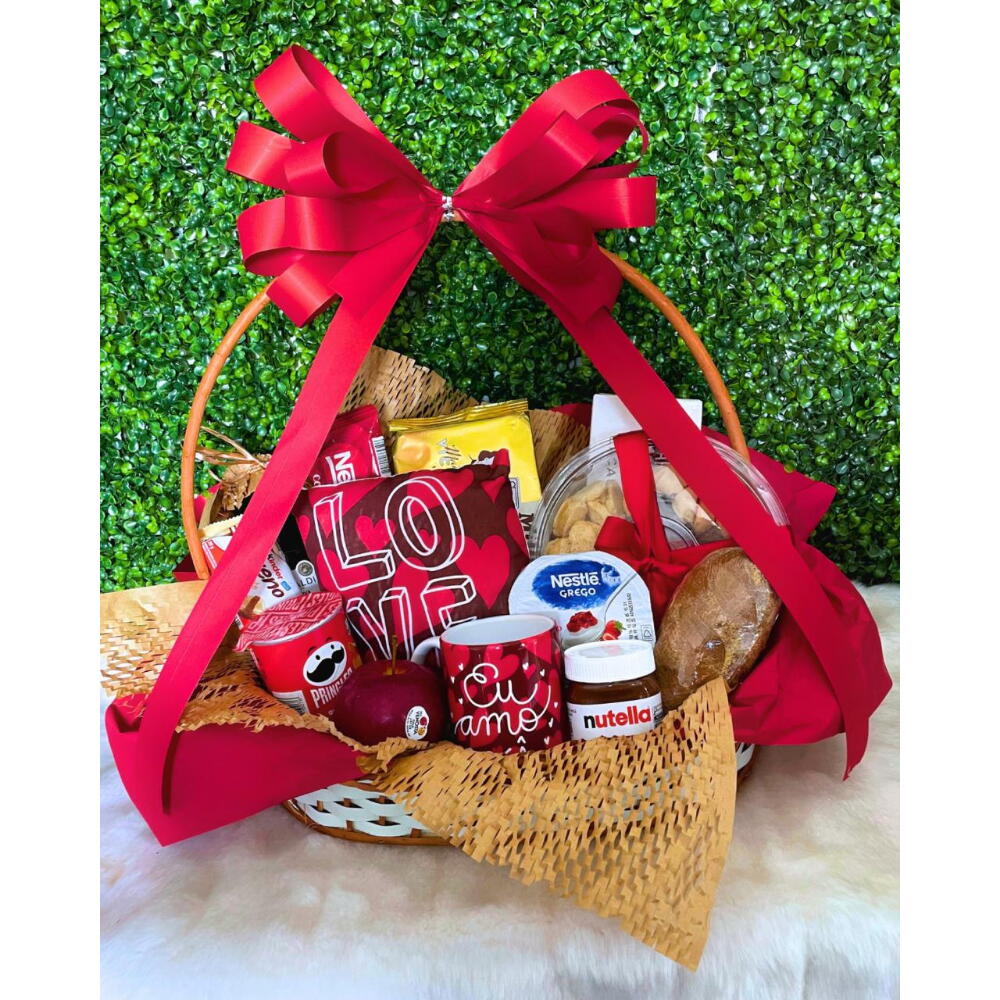 nutella - 1 un. amandita - 1 un. pão australiano - 1 un. iogurte grego - 1 un. cesta decorada - 1 un. mini pringles - 1 un. suco integral - 1 un. chocolate nestlé - 1 un. caneca temática - 1 un. embalagem especial - 1 un. maçã importada - 1 un. cookie artesanal - 1 un. carta cortesia - 1 un. almofada apaixonada - 1 un. biscoito vicenzi - 1 un. mix de snacks - 1 un. bolachas amanteigadas e torradas - 1 un.