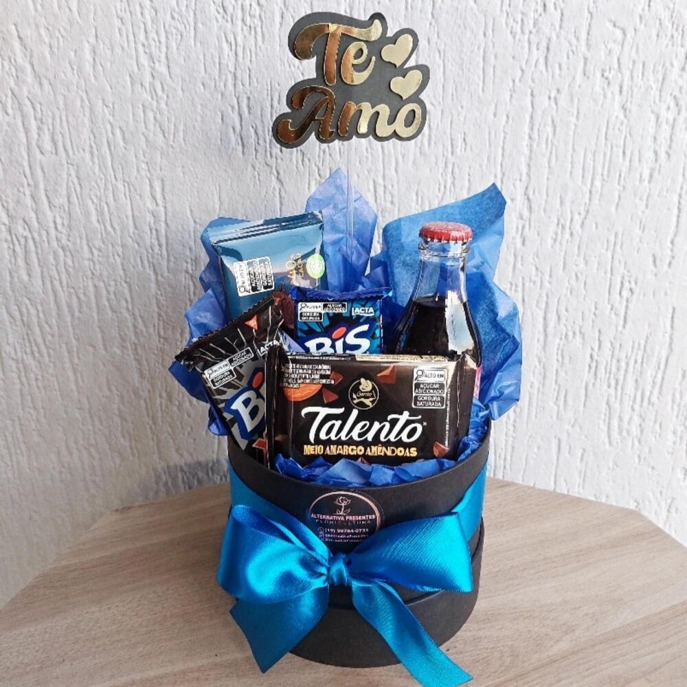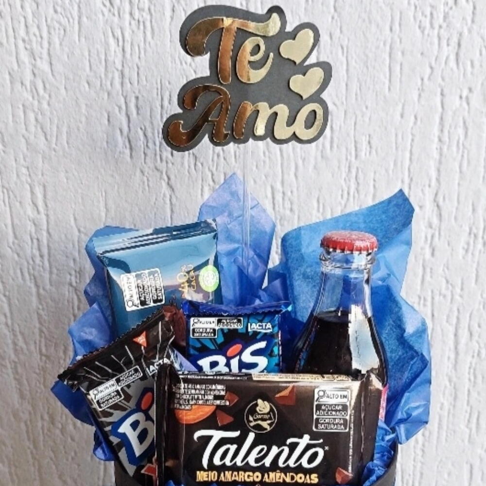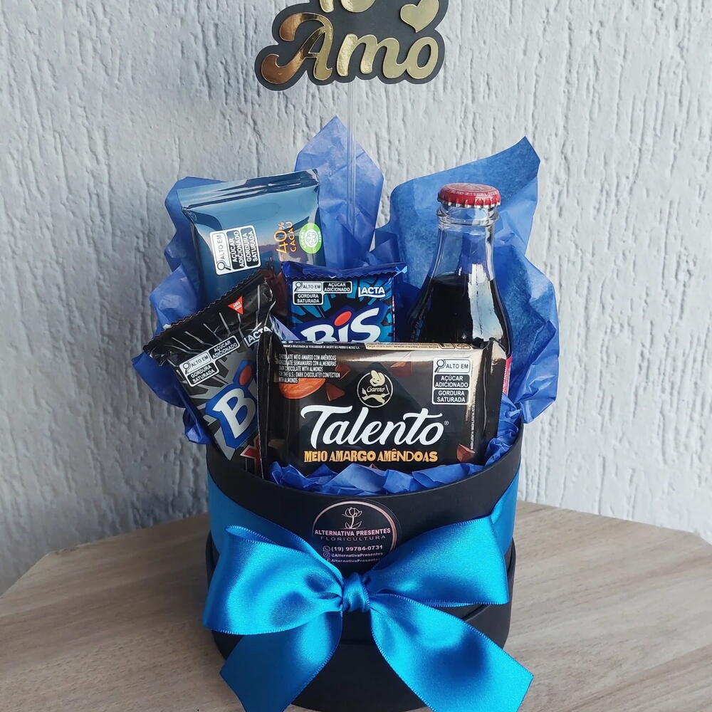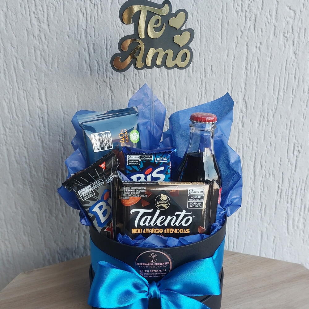 bis extra 45g - 2 un. caixa box cartonada - 1 un. laço e saco celofane para embrulho - 1 un. plaquinha te amo pai - 1 un. barra de chocolate talento 85g - 1 un. barra lacta 40% cacau 80g - 1 un. coca-cola vidro 250ml - 1 un. laço de cetim azul - 1 un.