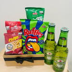 bombom ouro branco - 2 un. stiksy - 1 un. cerveja long neck - 2 un. batata ruffles - 1 un. ovinhos de amendoim 65 gramas - 1 un. pingo de ouro - 1 un. cesta decorativa com laço - 1 un.