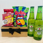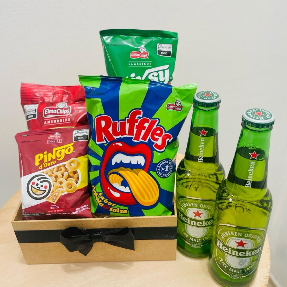 Este presente magnífico vem recheado de delícias para serem apreciadas em um momento especial. Nosso conjunto inclui 2 unidades de bombom ouro branco, irresistíveis e cheios de sabor, acompanhados de uma unidade de Stiksy, a crocância que não pode faltar. Para degustar com os petiscos, selecionamos 2 cervejas long neck, ideais para refrescar o paladar. Saboreie também a nossa batata Ruffles e os ovinhos de amendoim, que trazem a quantidade certa de 65 gramas para o lanche perfeito. Adicione o toque final com o Pingo de Ouro, um doce tradicional que encanta a todos. Todas essas delícias são cuidadosamente embaladas em uma cesta decorada com um laço, tornando este presente ainda mais especial. Surpreenda alguém com este conjunto encantador!