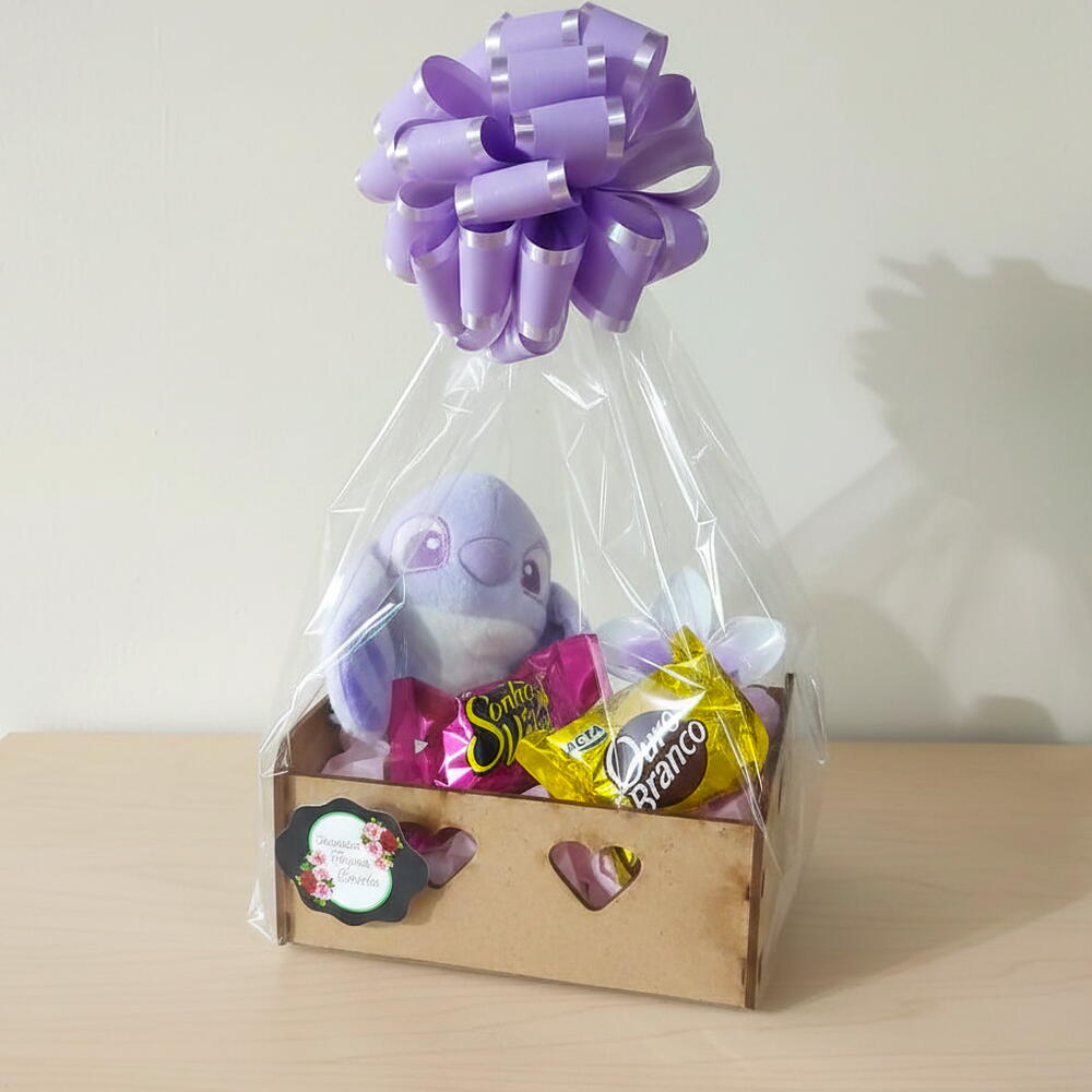 embalagem - 1 un. laço - 1 un. bombom - 2 un. pelucia - 1 un. presilha de cabelo - 1 un.