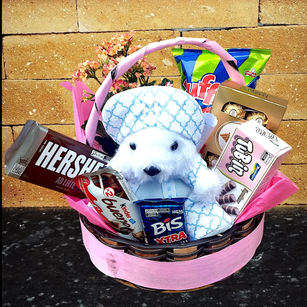 barra de chocolate - 1 un. ferrero rocher 8 unidades - 1 un. pelúcia - 1 un. kinder bueno - 1 un. cesto de vime - 1 un. kalanchoe cores variadas - 1 un. bis extra - 1 un. kit embalagem com laço personalizado e saco transparente - 1 un. ruffles 33g - 1 un. canudo de chocolate - 1 un.