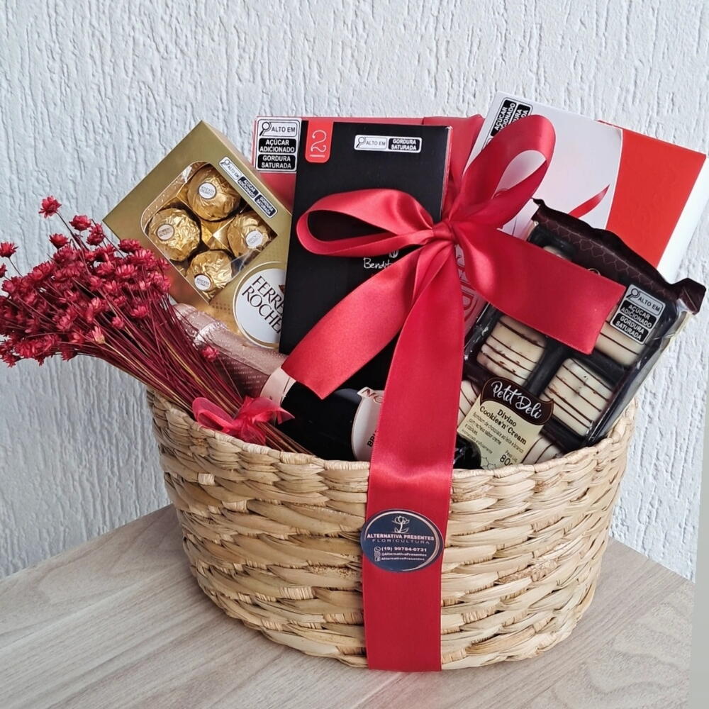 laço de cetim - 1 un. flores secas - 1 un. barra de chocolate cacau show - 1 un. caixa 8 bombons ferrero rocher - 1 un. laço e saco celofane para embrulho - 1 un. cesto de palha feito a mão - 1 un. espumante baby chandon - 1 un. caixa 3 bombons lindt lindor - 1 un. caixa 20 bombons milka - 1 un. caixa 6 bombons petit deli cacau show - 1 un. caixa 9 bombons rafaello - 1 un.