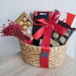 Mergulhe em um mundo de autêntico prazer ao descobrir nossa requintada Cesta de Chocolate. Todas as delícias estão maravilhosamente acomodadas em um intrincado cesto de palha, feito à mão, que inclui um sortimento de chocolates de marcas premium - uma barra de chocolate Cacau Show, uma caixa Ferrero Rocher de 100g, uma caixa Lindt Lindor de 37g, chocolates Milka e um Petit Deli também da Cacau Show, finalizando com uma caixa de chocolates Rafaello. Para um toque final de elegância, um laço de cetim maravilhosamente amarrado completa o presente. Porém, este presente ainda tem uma surpresa, um espumante Baby Chandon para brindar momentos especiais. Tudo isso envolto em celofane e decorado com flores secas. Um verdadeiro presente para surpreender e deleitar.
