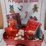 sonho de valsa - 1 un. caixa com visor - 1 un. pelucia chaveiro de natal - 1 un. árvore decorativa - 1 un. mini balão estrela decorarivo - 1 un. panetone santa edwiges - 1 un. cesta vermelha metalizada - 1 un. lata luminária st edwiges - 1 un.