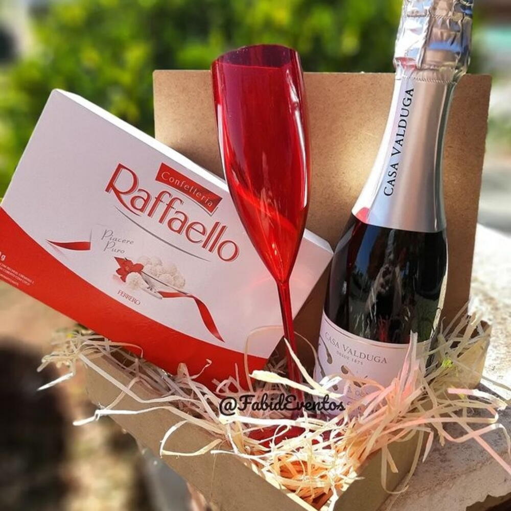 caixa em mdf com tampa - 1 un. chandon baby 175ml - 1 un. caixa rafaello 10un - 1 un. taça champanhe - 1 un.